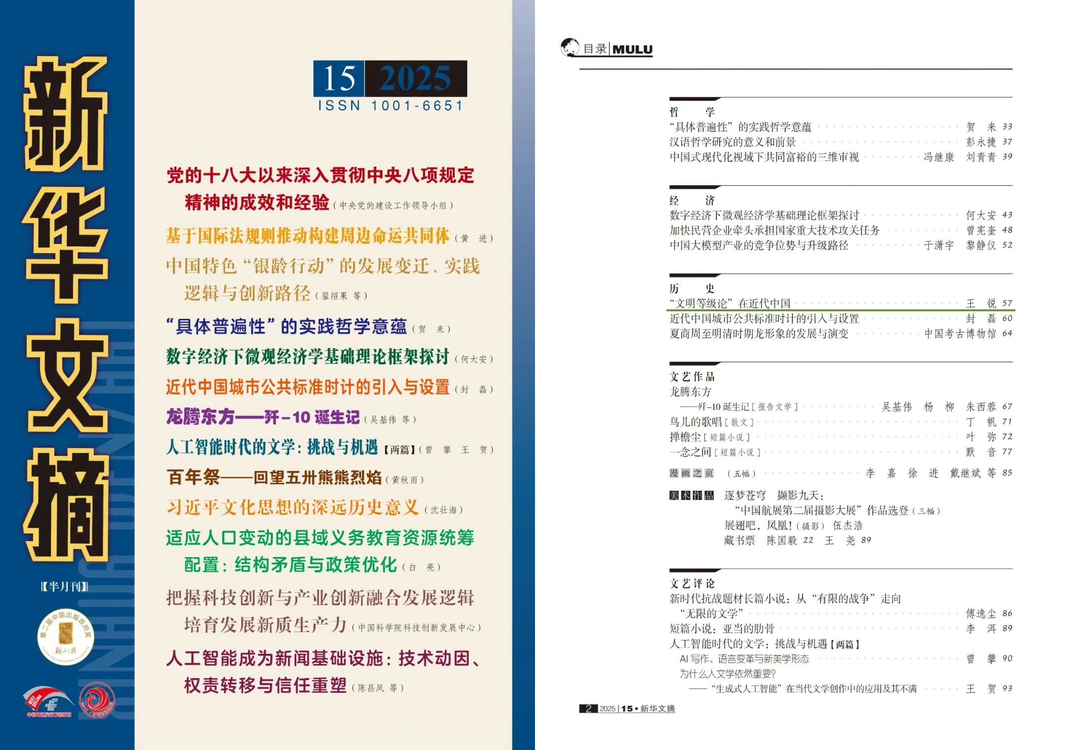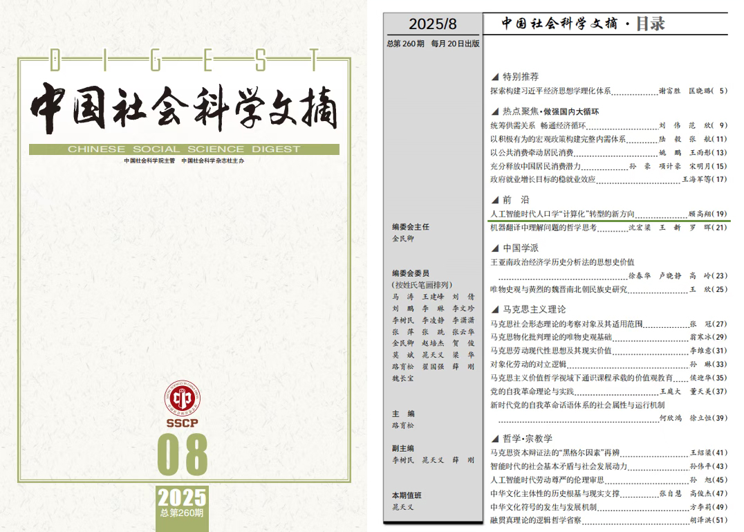 华东师范大学人口研究所副研究员顾高翔《人工智能时代人口学“计算化”转型的新方向》一文被《中国社会科学文摘》2025年第8期转载。文章摘自《求索》2025年第2期。
