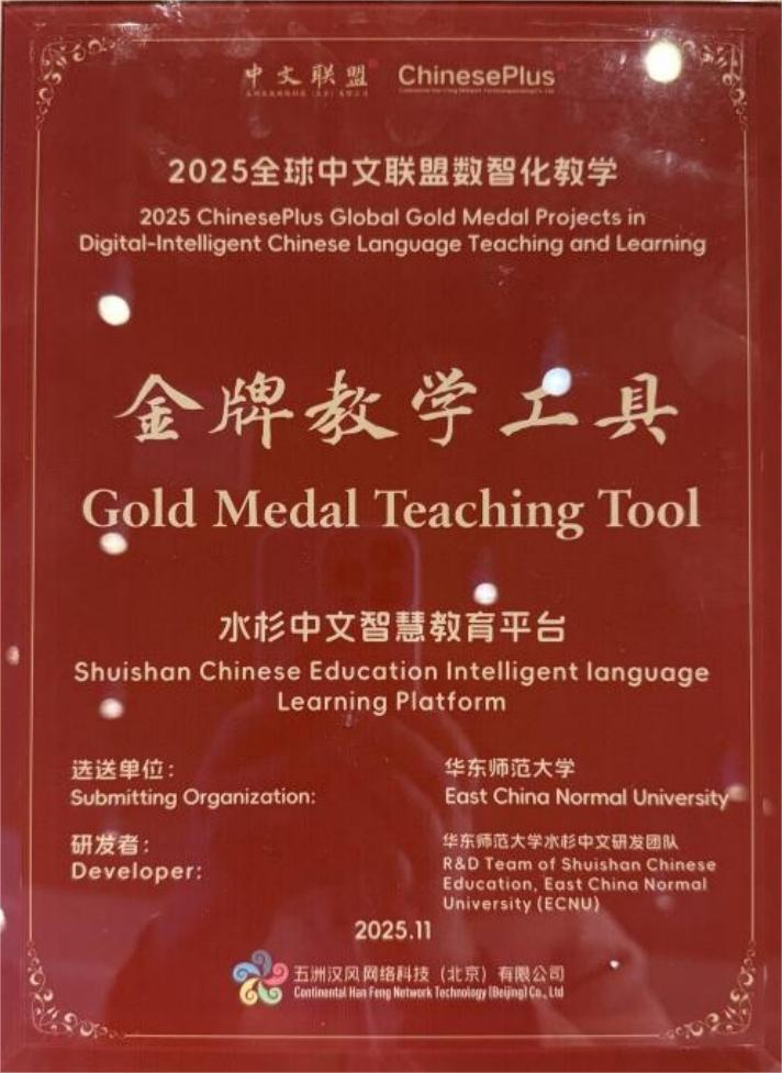 在2025世界中文大会上,华东师范大学自主研发的“水杉中文(Shuishan ChineseEdu)”智慧教育平台荣获“2025全球中文联盟数智化教学金牌教学工具”,并作为全球仅有的12个覆盖“教、学、研”全场景的国际中文AI产品之一,首发入驻中文联盟新平台。华东师大因在数智化国际中文教学领域的卓越综合实力,获评“2025全球中文联盟数字化教学金牌合作伙伴”。