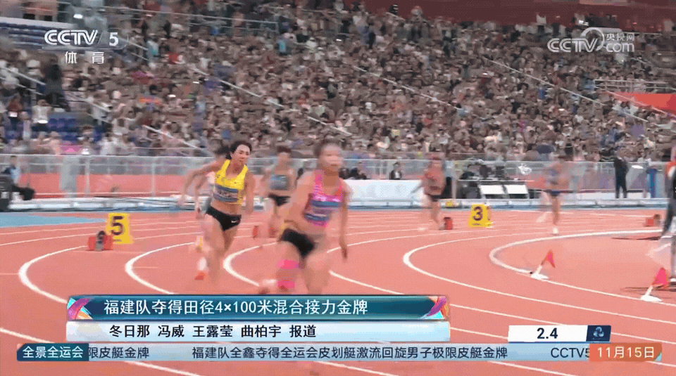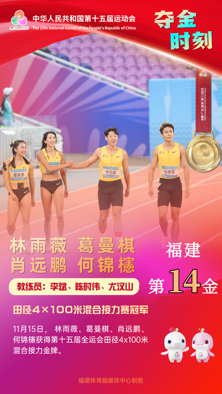 11月15日晚,第十五届全国运动会田径项目4X100米混合接力决赛在广东奥林匹克体育中心举行,由华东师大葛曼棋、林雨薇等队员组成的福建队以40.37秒的成绩夺得金牌,刷新了该项目全国以及亚洲纪录!