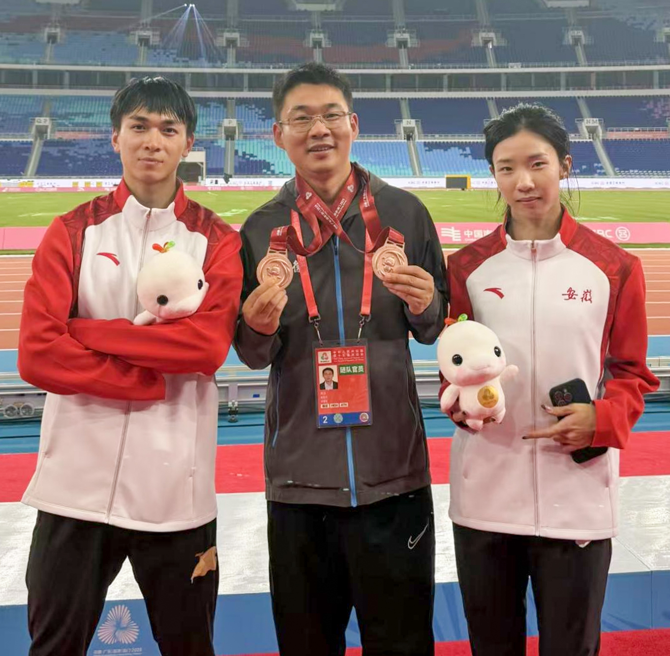 此外,在田径项目4X400米混合接力决赛中,2024级体育人文社会学专业硕士生周莉与校友陈治旺代表安徽队,凭借出色发挥,以3分19秒54的成绩获得铜牌。