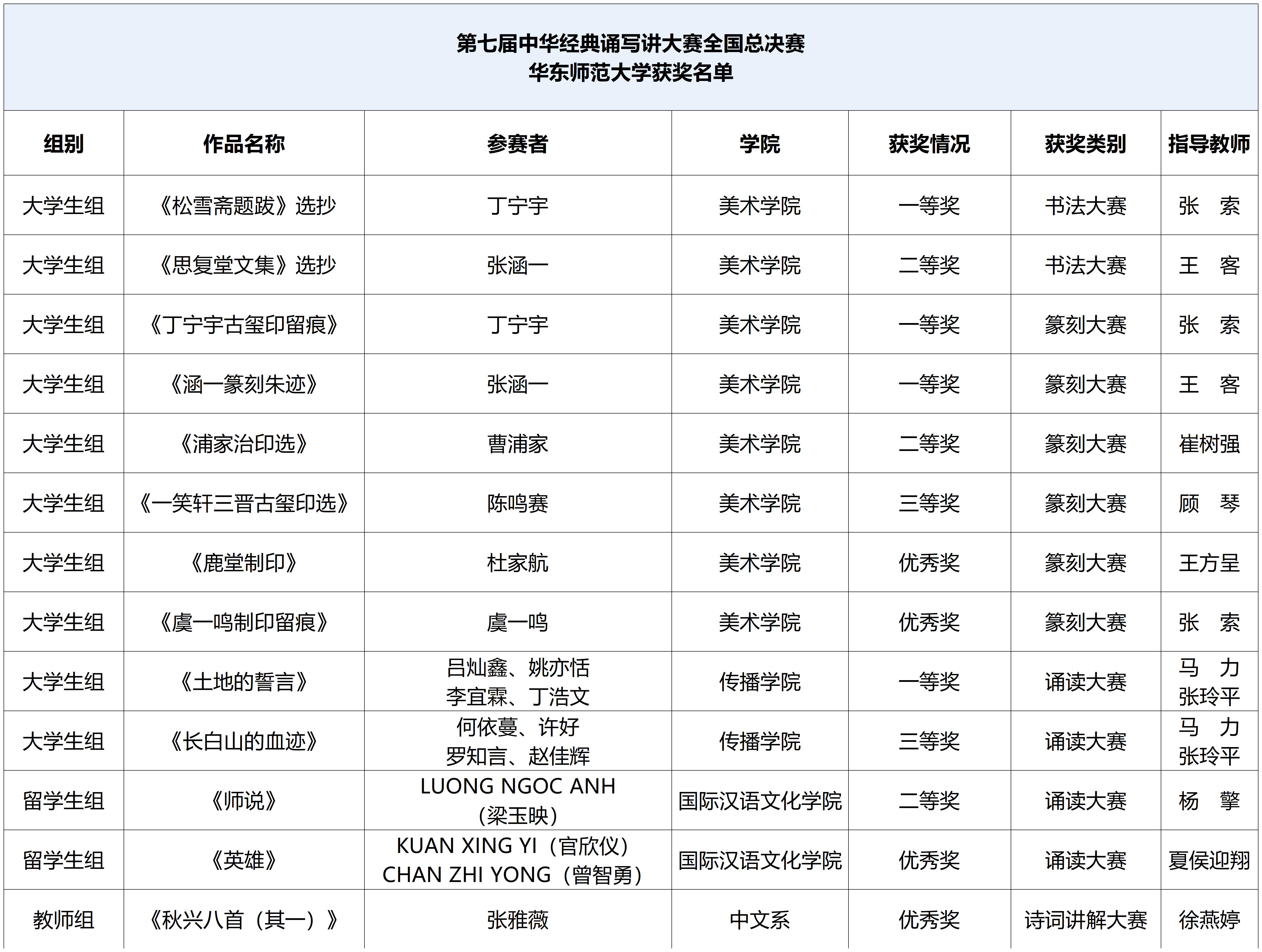 此次大赛的成绩不仅是对获奖师生个人才华与辛勤付出的高度肯定,更是学校全面落实立德树人根本任务,着力提升学生语言文字应用能力、审美素养和人文情怀,坚定文化自信所结出的硕果。华东师大将继续深耕中华优秀传统文化的教育、研究与实践创新,引导广大师生从经典中汲取精神力量,担当起传承与发展中华文明的时代使命。