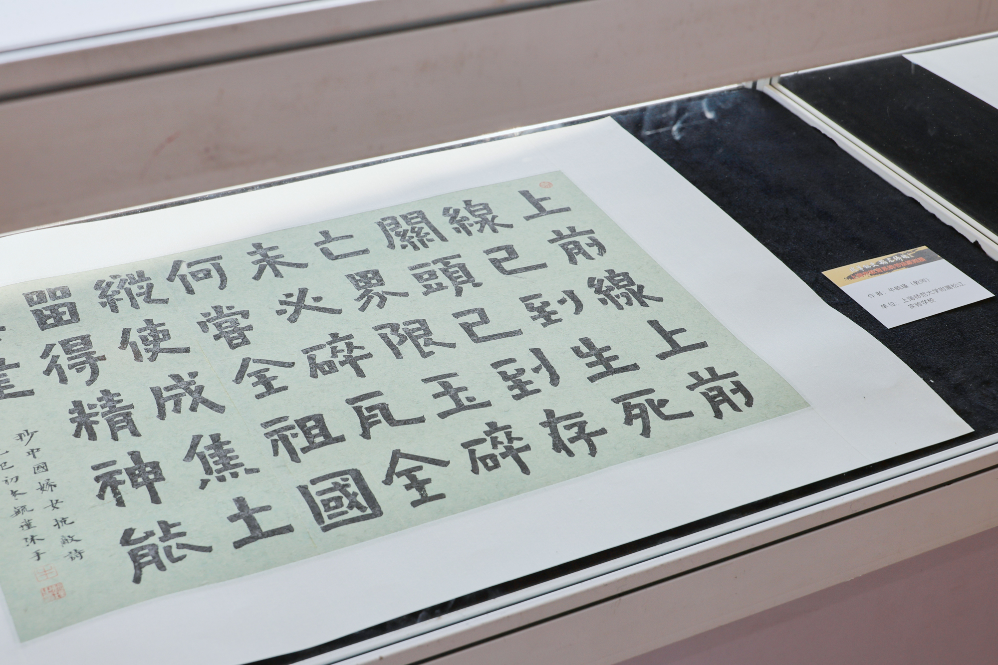 此次展览由上海市教卫工作党委、上海市教委、上海市社联指导,华东师范大学、大中小学思想政治教育一体化建设创新发展中心联合主办。紧扣“铁笔铭史 翰墨铸魂”主题,汇聚了上海市41所大中小学近百位师生的书法篆刻作品,注重体现思想内涵与精湛艺术相结合,内容涵盖抗战诗文、烈士家书、历史文献等,既有《台儿庄大捷》《百团大战》等对重大历史事件的磅礴书写,也有展现吉鸿昌《就义诗》、赵一曼《给儿子的信》、胡琏《给妻子的家书》、郝梦龄《遗书》等家国遗墨的深情笔触;既有书写先辈诗文的翰墨华章,也有《山河无恙》《强国有我》《众志成城》《浩气贯长虹》《一寸丹心图报国》等直抒胸臆、铿锵有力的铭心之作,生动诠释了中华民族不屈不挠、浴血奋战的英雄气概和爱国情怀。