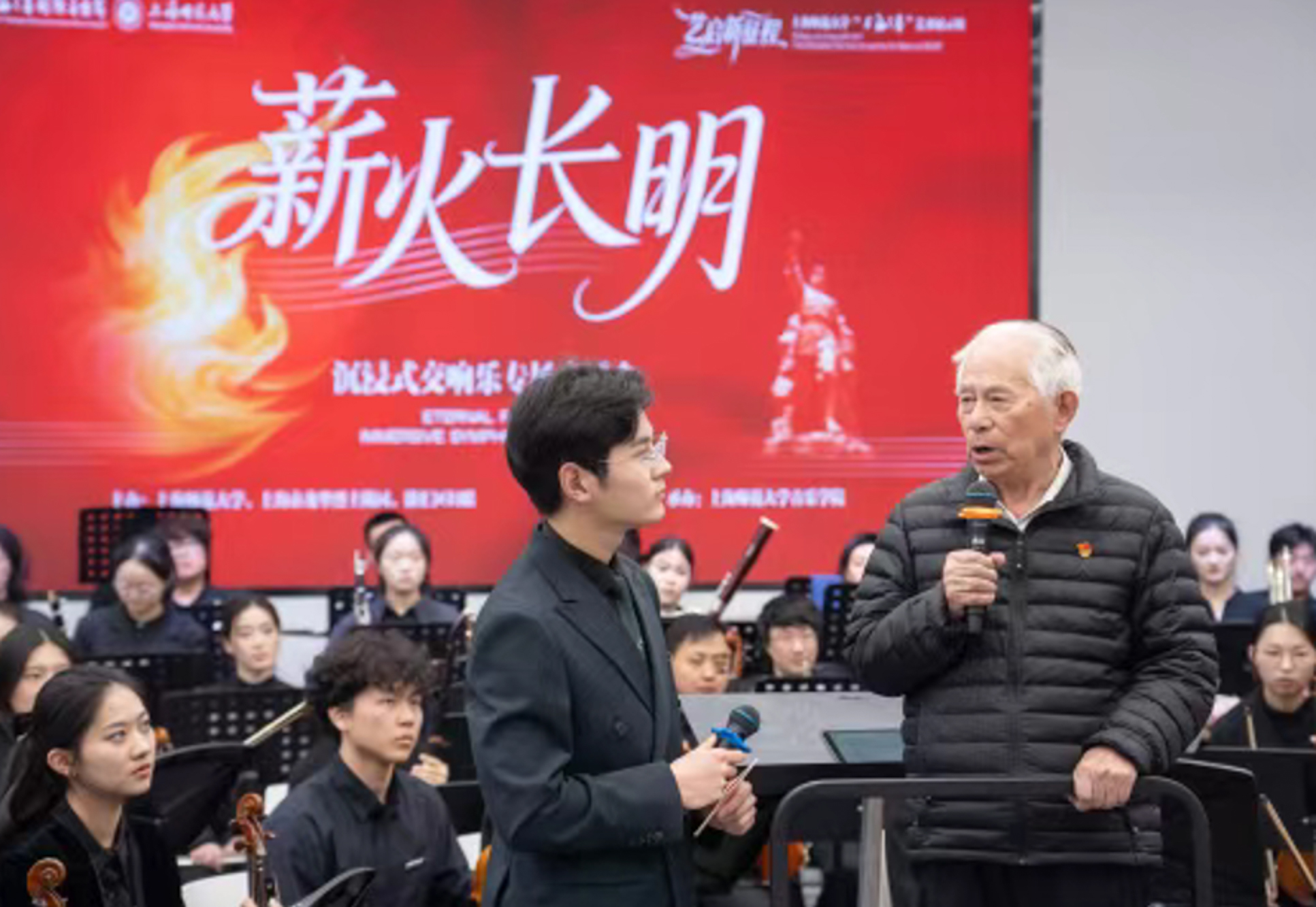 外语学院的师生们还参加了沉浸式音乐党课。在交响诗《龙华塔》的创作者何占豪的讲述中,在如泣如诉的音乐声中,感受那段波澜壮阔的岁月。