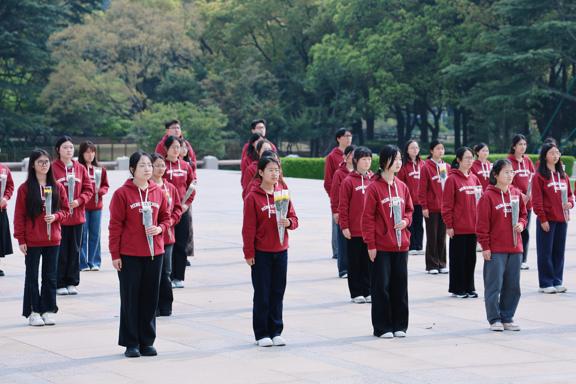 在庄严肃穆的龙华烈士陵园纪念碑前,全体师生整齐列队,奏唱国歌,向革命先烈三鞠躬、默哀致敬。
