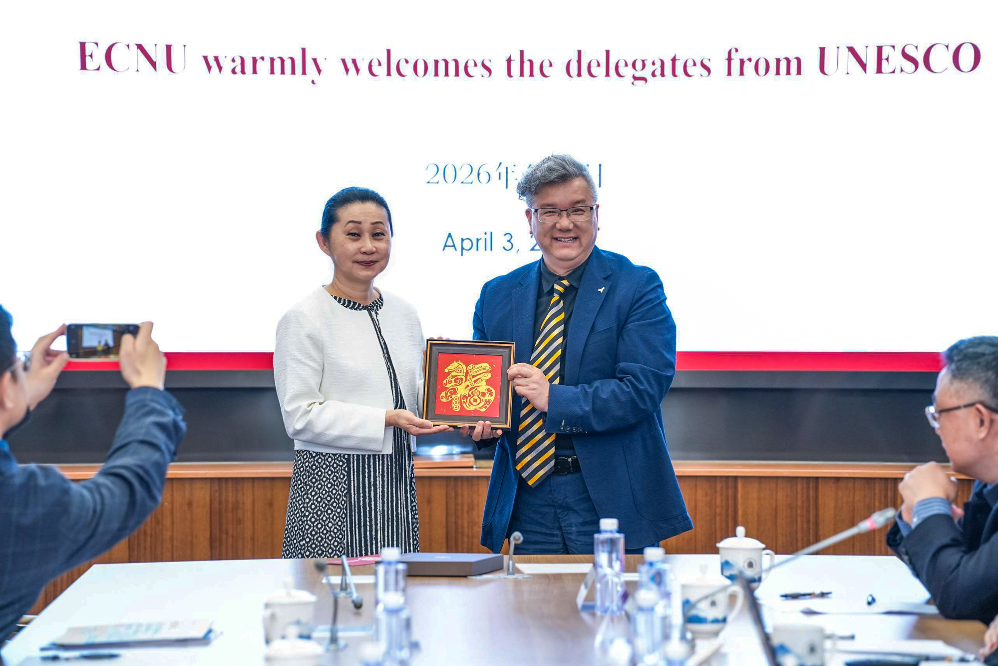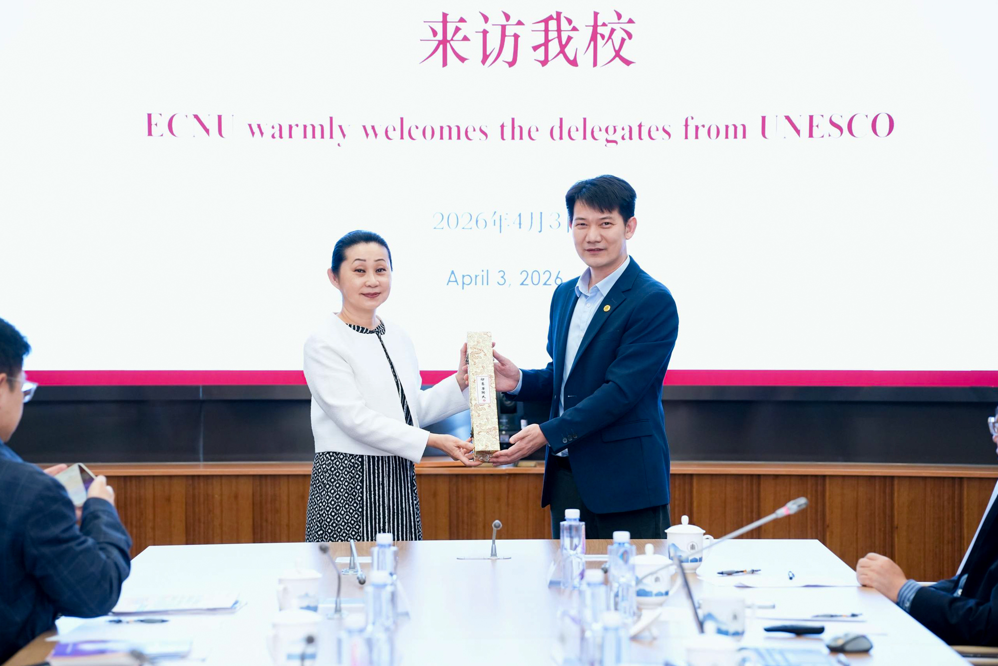 华东师范大学副校长吴健与华东师范大学课程与教学研究所所长崔允漷分别向联合国教科文组织代表团赠送纪念礼品