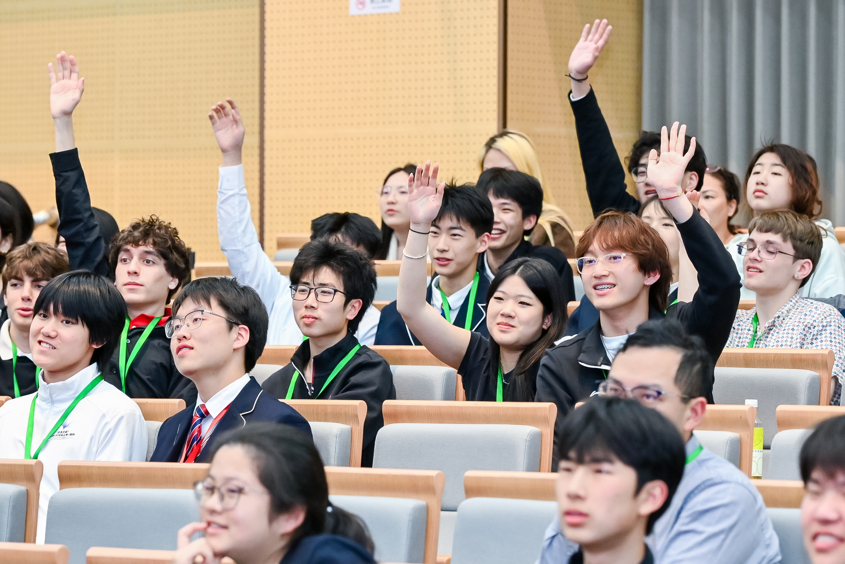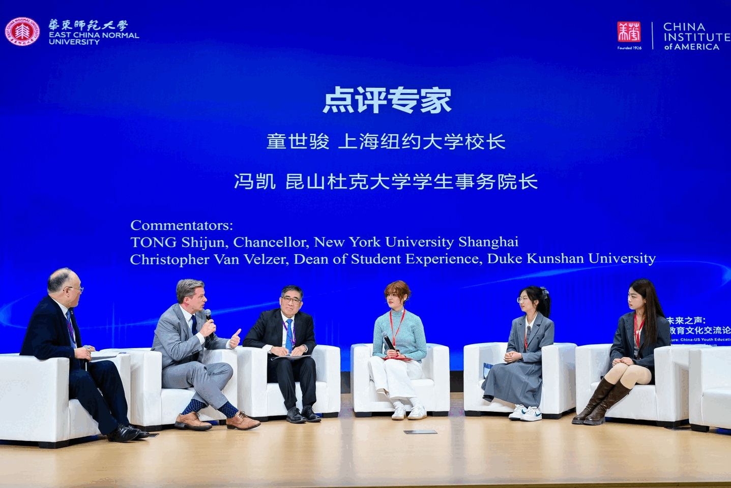 在“未来课堂与教育变革:青年视角的教育想象”的中美大学生对话环节,来自上海纽约大学和华东师范大学的中美大学生围绕人工智能时代的高等教育、学习变革及未来教育想象等议题发表观点,并与上海纽约大学校长童世骏、昆山杜克大学学生事务院长冯凯(Christopher Van Velzer)进行了深入探讨。