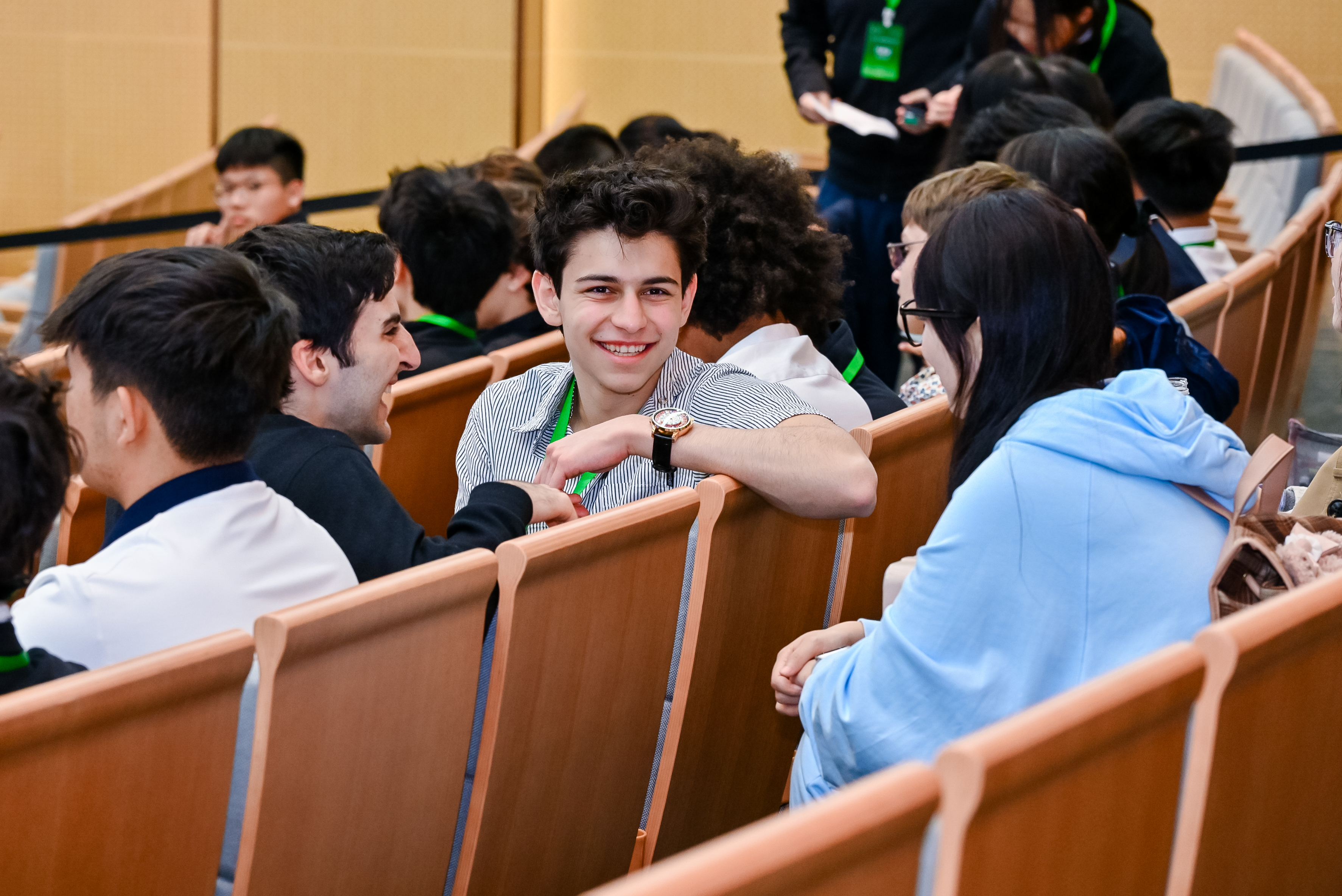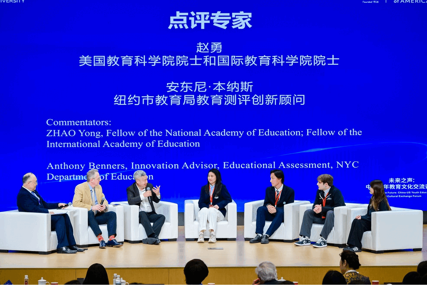 紧接着,发言学生与美国教育科学院院士、国际教育科学院院士赵勇,纽约市教育局教育测评创新顾问安东尼·本纳斯(Anthony Benners)开展对话。