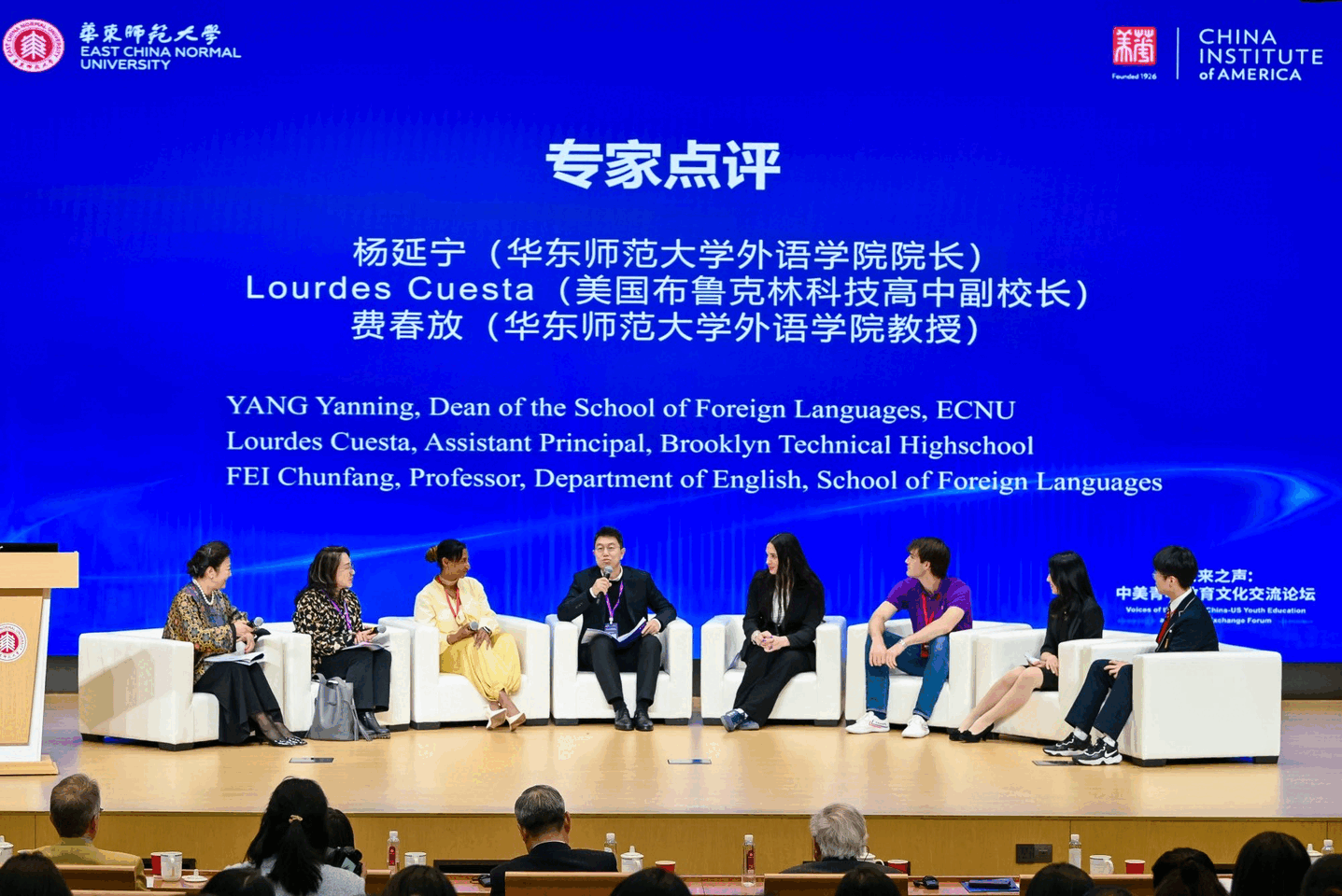发言结束后,学生代表与华东师范大学外语学院院长杨延宁、美国布鲁克林科技高中副校长Lourdes Cuesta、华东师范大学美国研究中心原主任费春放教授开展座谈、交流观点。随后,全体来宾共同参与了跨文化互动问答环节。