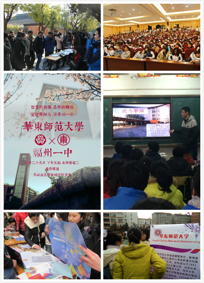 对于我校学生志愿者的招生宣传活动,福建省福州市第一中学教务处主任陈德燕这样评价:“学校宣传到位,受同学欢迎,工作仔细、扎实、有成效,很好!”今年1月29日,我校张晨麟、陈思佳、檀彦超、余丹丹等6位同学走进母校福州一中,为学弟学妹讲述“从凤凰池到丽娃河的故事”。他们精心策划活动,设计张贴了32张不同风格的海报,邀请毕业于华师大的母校老师参与宣讲,宣讲会后仍保持联系,为学弟学妹提供更多帮助。汪冬、汪敏、张晨3位同学,在安徽黄山歙县中学宣讲活动结束后,创建了华师大招生交流QQ群,与歙县中学的同学交流备考心得,还拍摄高考励志视频华师大篇,开通提供招生咨询、分享心路历程的微信公众号。而李孟飞、马铃等同学,除了回到母校上海延安中学举办讲座,以自身经历介绍充满“爱”的华东师大,还策划拍摄了“延安人在师大”的宣传片,在延安中学午休时间播放,并组织延安中学师生参观华师大,让学弟学妹切身感受华师大。