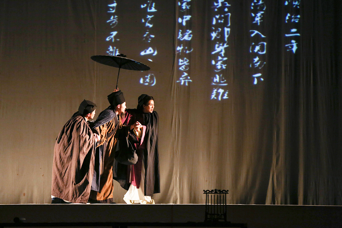 值得一提的是,该剧的舞美设计如同《富春山居图》,清新淡雅又富于变化,行草写就的题跋随着剧情的演变,不时投影在天幕上,优雅别致,与剧情相得益彰,整个舞台犹如一幅流动的山水画卷。