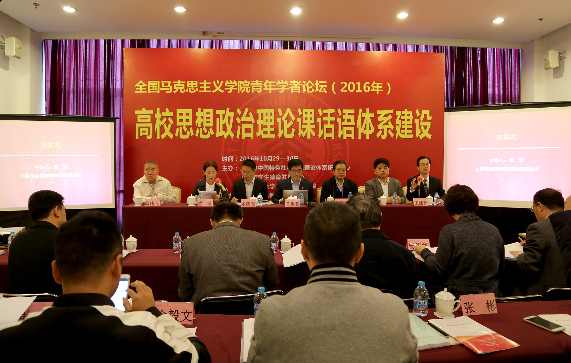 10月29日、30日,第一届全国马克思主义学院青年学者论坛在我校闵行校区举行。论坛以高校思想政治理论课话语体系建设为主题,由上海市中国特色社会主义理论体系研究中心、上海市学生德育发展中心、我校马克思主义学院主办,《思想理论教育》编辑部和《思想政治课研究》编辑部协办。来自中国社会科学院、上海市委宣传部、上海市社联、清华大学、南开大学、吉林大学、中国人民大学、武汉大学、同济大学等单位的领导和青年学者济济一堂,在十八届六中全会后率先共同研讨高校思想政治理论课话语体系建设。