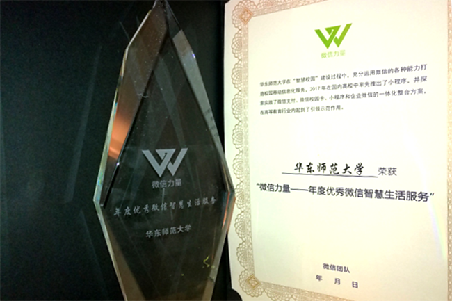 1月15日,作为中国互联网行业极具影响力的年度盛会,2018微信公开课PRO版在广州保利世贸博览馆举办。在活动当晚的晚会上,微信团队发布了主题为“微信力量”的年度奖项,向行业优秀案例颁奖。华东师大获颁“年度优秀微信智慧生活服务奖”,是全国唯一获此奖项的高校。