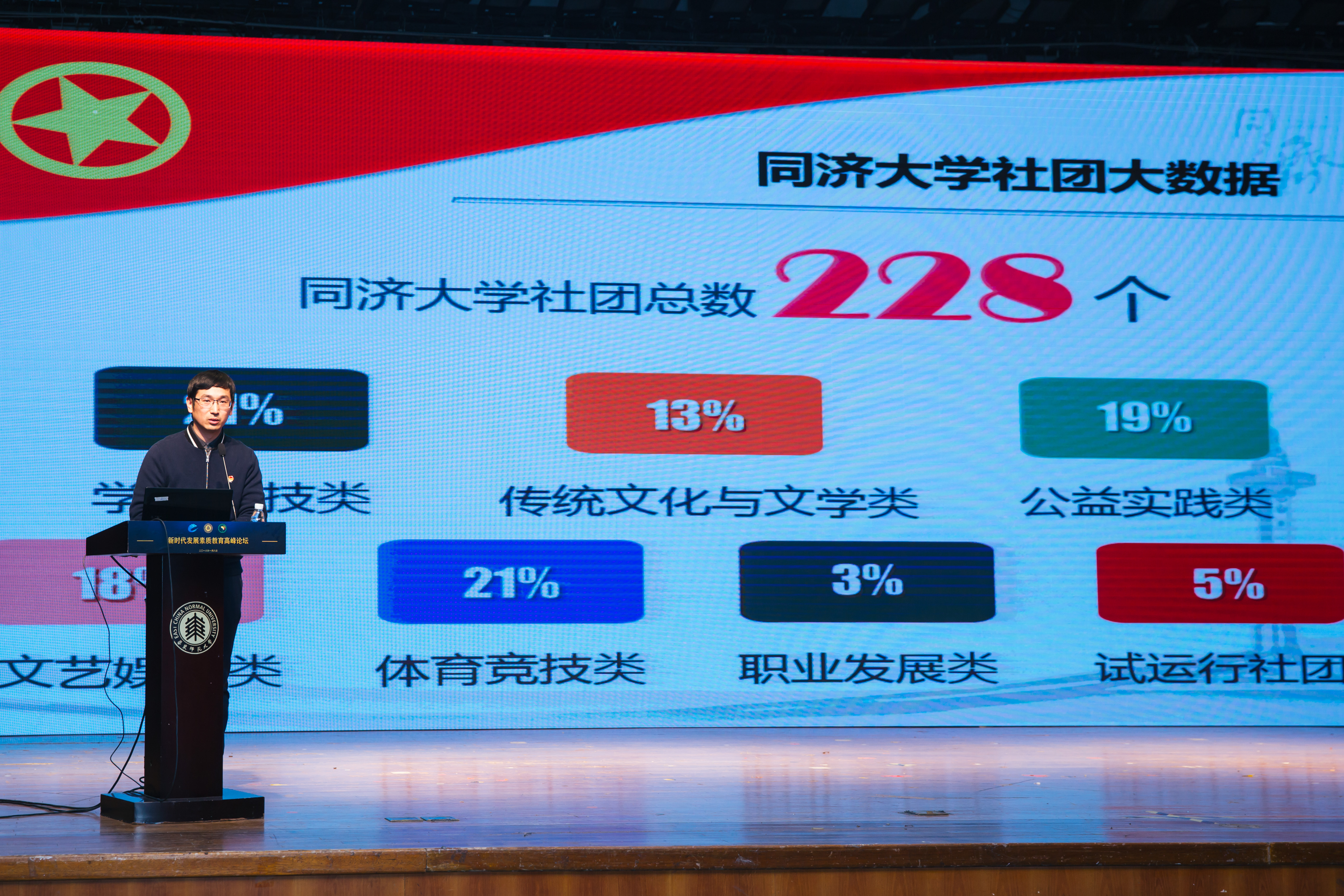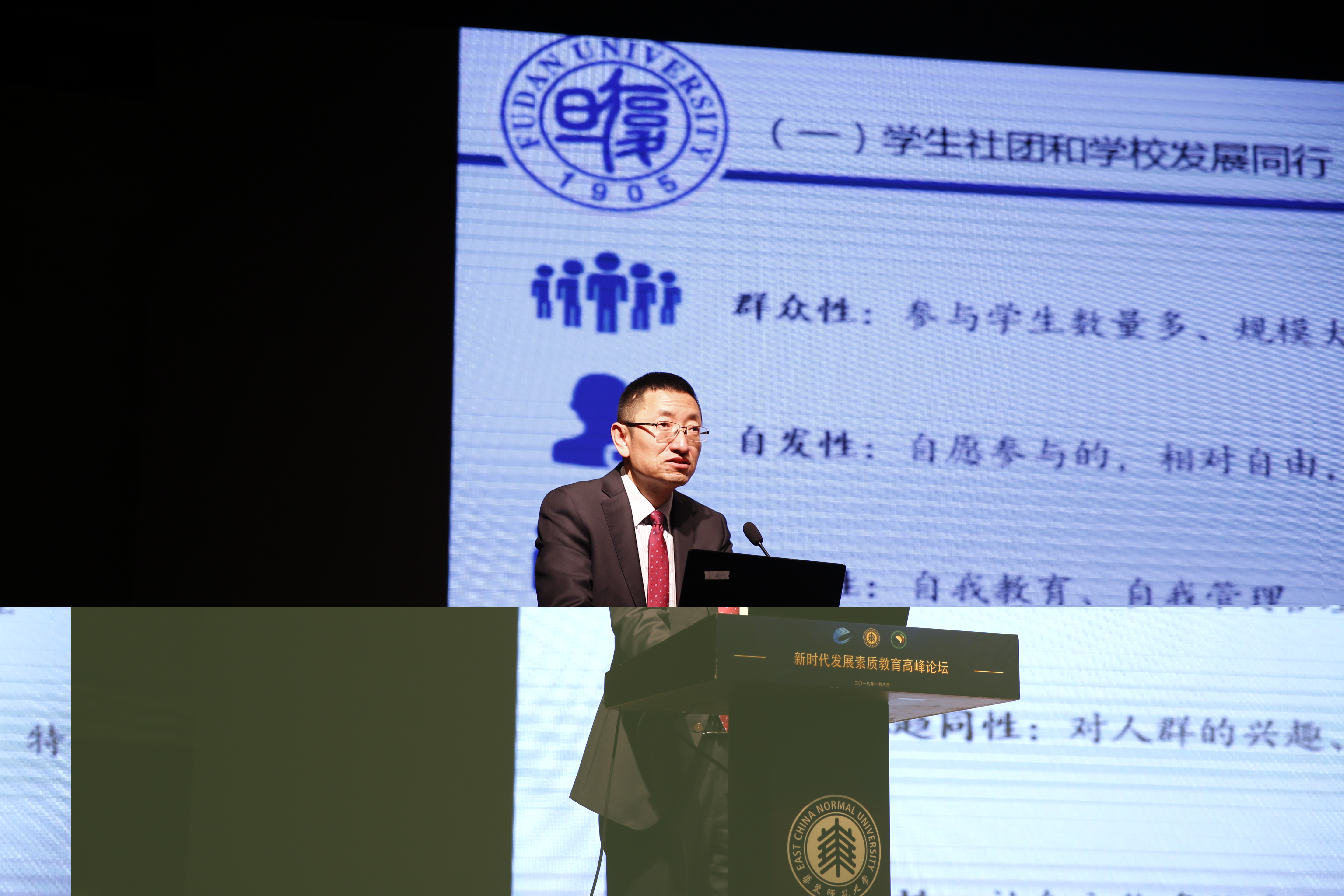 1月8日,由华东师范大学、中国教育报刊社、中国高等教育学会大学素质教育研究分会共同举办的“社团建设,实践育人——新时代发展素质教育高峰论坛”在华东师大中山北路校区思群堂举行。华东师范大学党委书记童世骏,中国教育报刊社党委副书记、纪委书记连保军,上海市教育委员会副主任郭为禄,厦门大学副校长邬大光,华东师范大学党委副书记方平,上海应用技术大学党委副书记、副校长张艳萍,复旦大学校长助理苟燕楠,中国高等教育学会大学素质教育研究会秘书长庞海芍,华东师范大学教育学部主任袁振国等出席论坛。