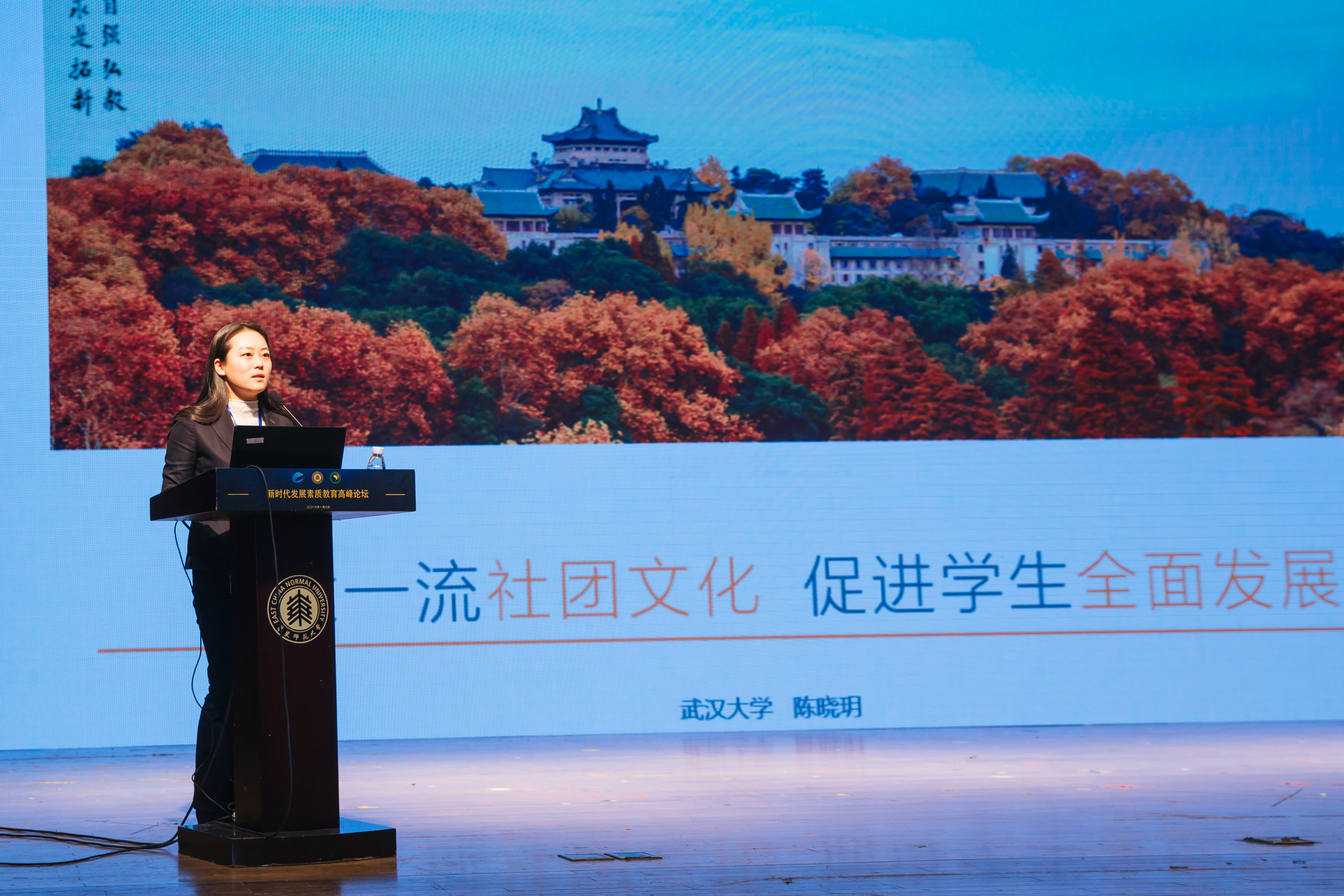 武汉大学党委学生工作部副部长陈晓玥在“构建一流社团文化,促进学生全面发展”的报告中,介绍了学生社团对于武汉大学文化的传承作用,以及增强当代大学生文化自觉与文化自信的重要意义。她指出,社团有助于提升大学文化软实力,发挥着通识教育的延伸手臂作用,是实践育人的重要途径。