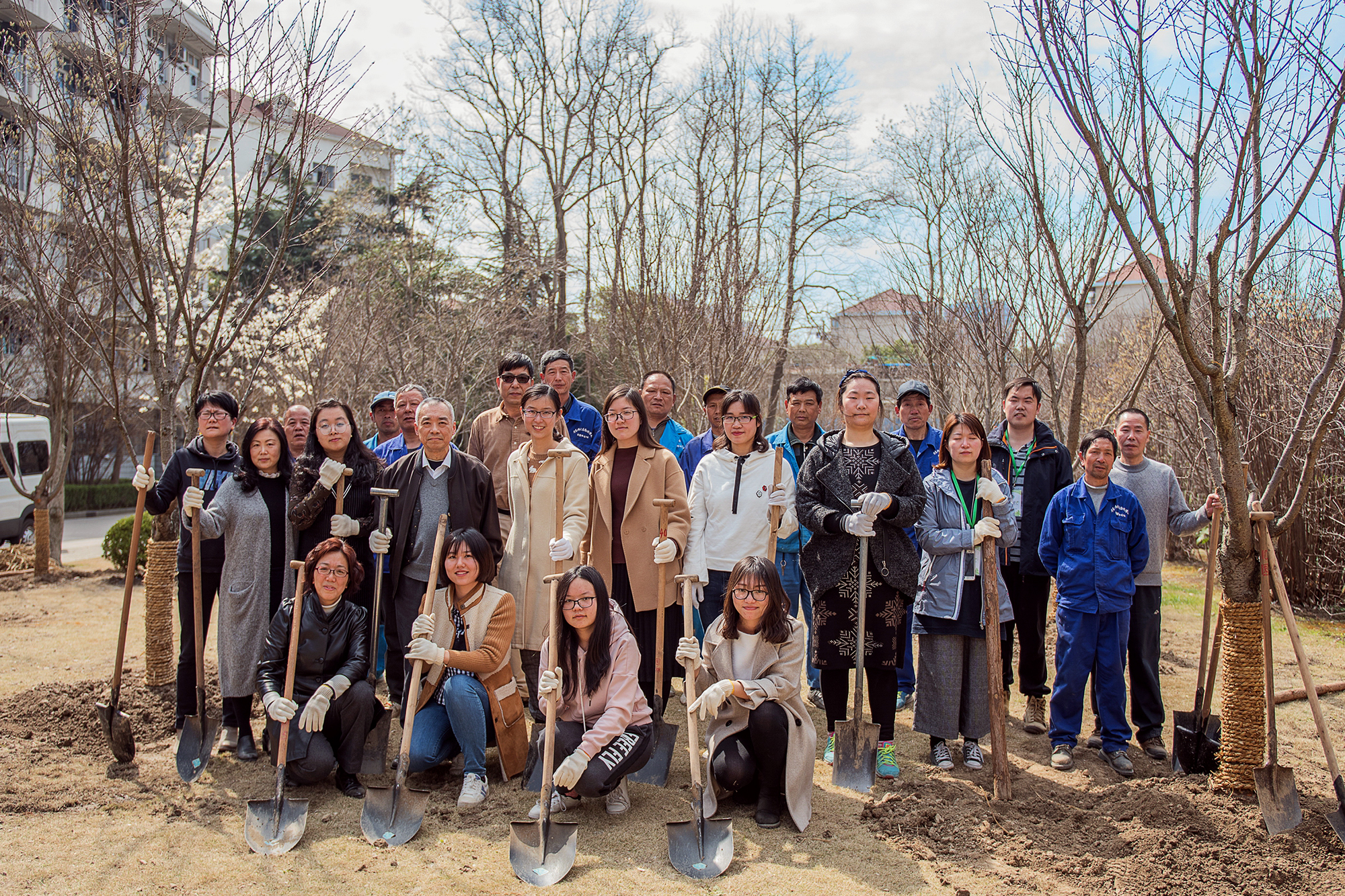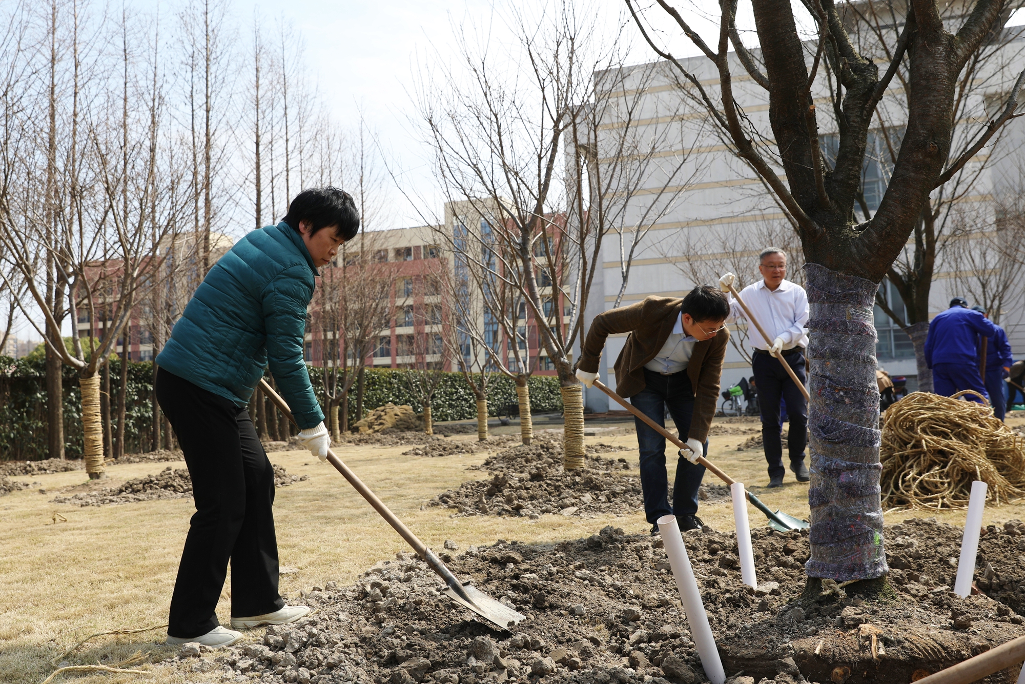 在闵行校区变电站北侧及中山北路校区河西食堂南侧空地上,参加植树的师生与工作人员三四人一组通力合作,他们挥锹挖土,干劲十足。在园艺师傅的指导下,两校区90余名师生共计种植樱花79棵。