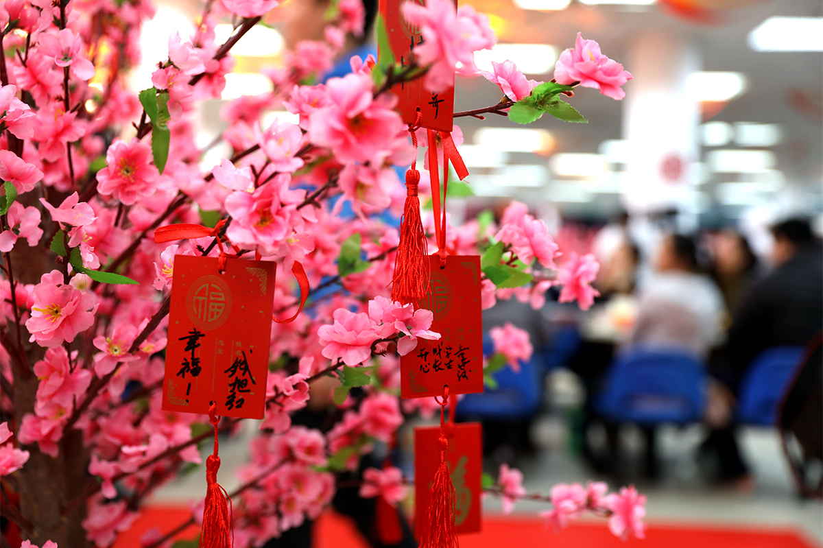 千门万户曈曈日,总把新桃换旧符。随后,师生们在桃符上写下新年祝福,挂上桃树。满载祝福的桃树把夏雨餐厅装点得更加喜庆。