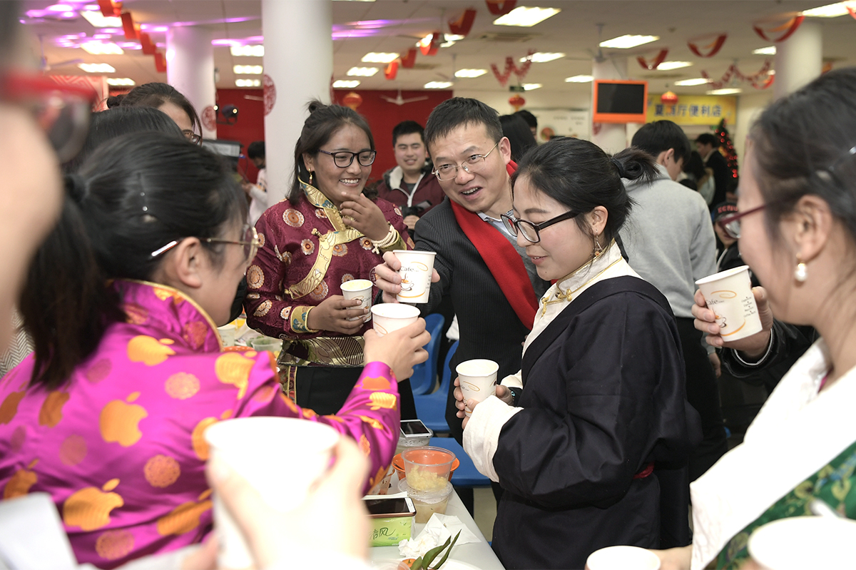 热热闹闹,喜迎新春。伴随着孟宪承书院和国际汉语文化学院同学们的藏族舞、蒙古舞《盛世欢歌》,学生们向老师们献上精心准备的新年贺礼——红围巾,以表达感恩之情。这份情比红围巾上的红色更热烈,浓浓的温暖在师生心间荡漾。校领导和老师们来到同学们中间,一一和各桌同学举杯共饮,互送祝福。