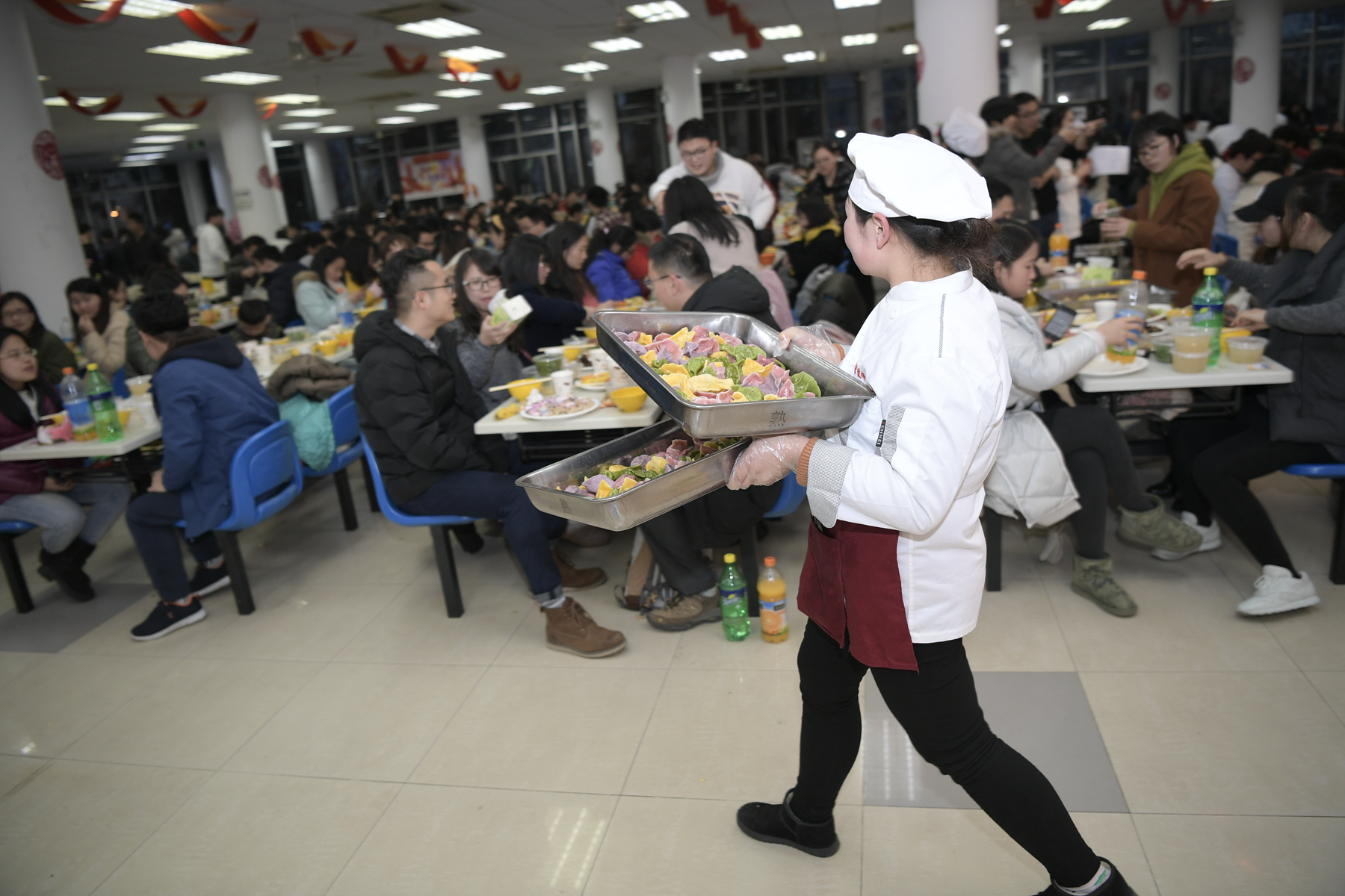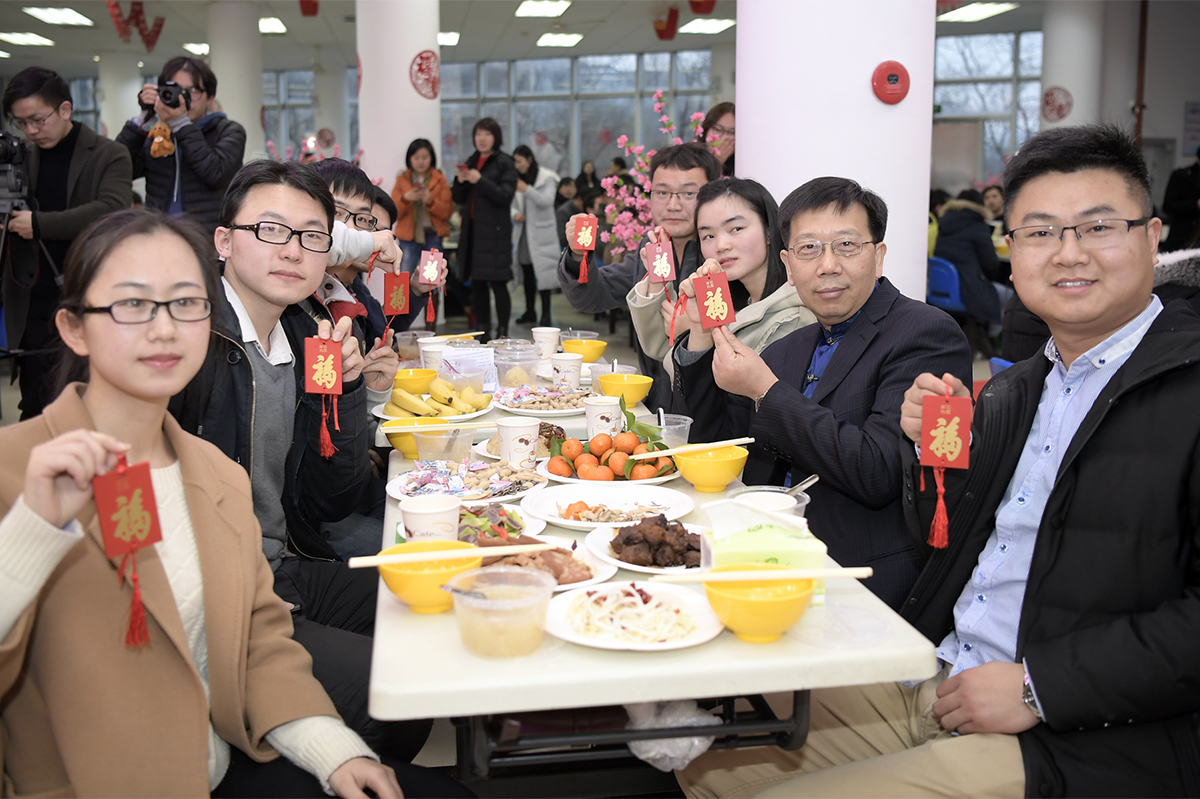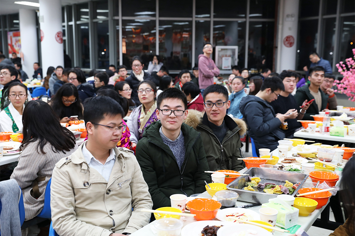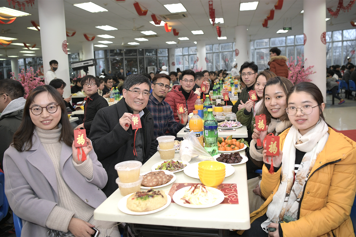 全体寒假留校学生与校领导、老师们共迎新年,是师大的传统。舞台上的文艺节目精彩纷呈,餐厅里张灯结彩、年味浓郁。在一首激情澎湃的打击乐《龙腾虎跃》中,2018年迎新春师生同乐会正式拉开了帷幕。