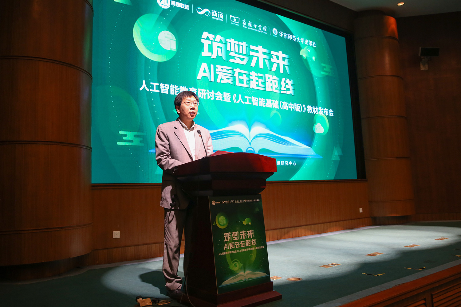现场,由我校慕课中心、商汤科技、上海知名高中优秀教师共同编著的全球第一本人工智能教材《人工智能基础(高中版)》正式发布,我校陈玉琨教授、田爱丽教授分别为该书的主编与执行主编之一;华东师范大学第二附属中学、上海交通大学附属中学、上海市七宝中学、上海市格致中学、上海市市西中学、上海市晋元中学等6所沪上知名高中的优秀教师团队应邀参与编撰。华东师范大学第二附属中学、清华大学附属中学、上海交通大学附中、上海市市西中学等40所全国学校成为首批“人工智能教育实验基地学校”。