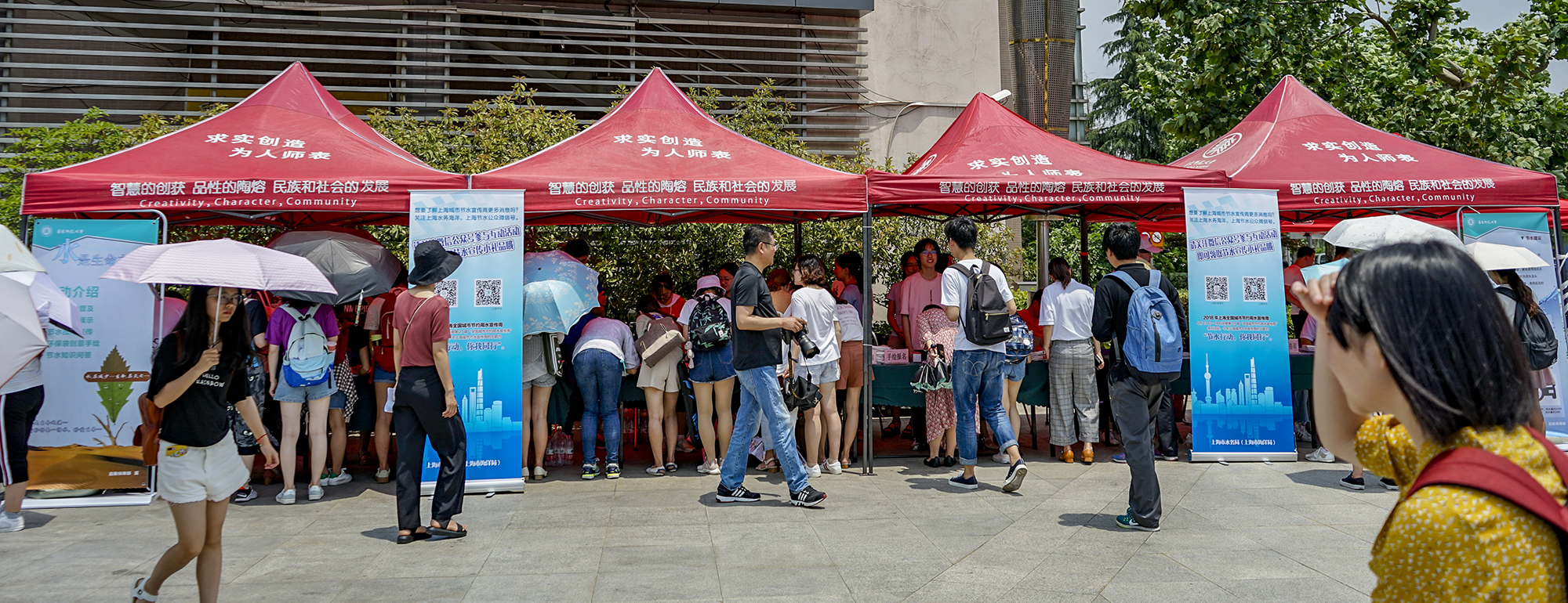 高校人员密集,是生活用水资源消耗的大户。同时,作为人才培养的摇篮,增强学生的节水意识、推广节水技术、宣传科学节水方法也更加重要。为了扩大节水宣传活动的影响范围,本次活动选择在人流量集中的午餐时间,在闵行校区华闵食堂门前广场设置了节水倡议签名墙、节水咨询、节水器具展示、节水有奖问答和节水创意手绘等摊位,中午炎热的天气也影响不了同学们参加节水活动的热情。