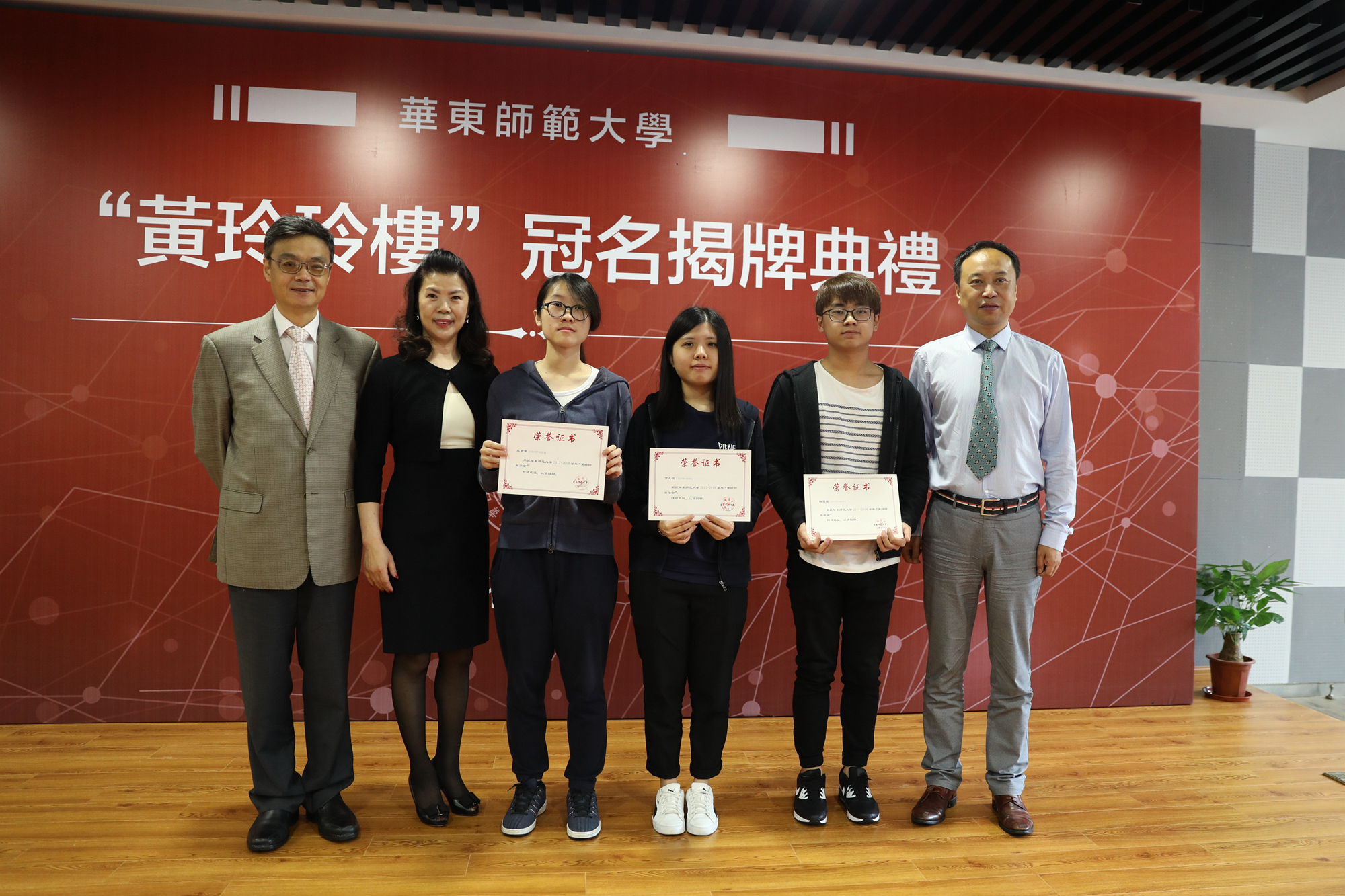 随后,黄玲玲、李鲁和戴立益为“黄玲玲奖学金”获奖学生颁奖并共同为黄玲玲楼揭牌。