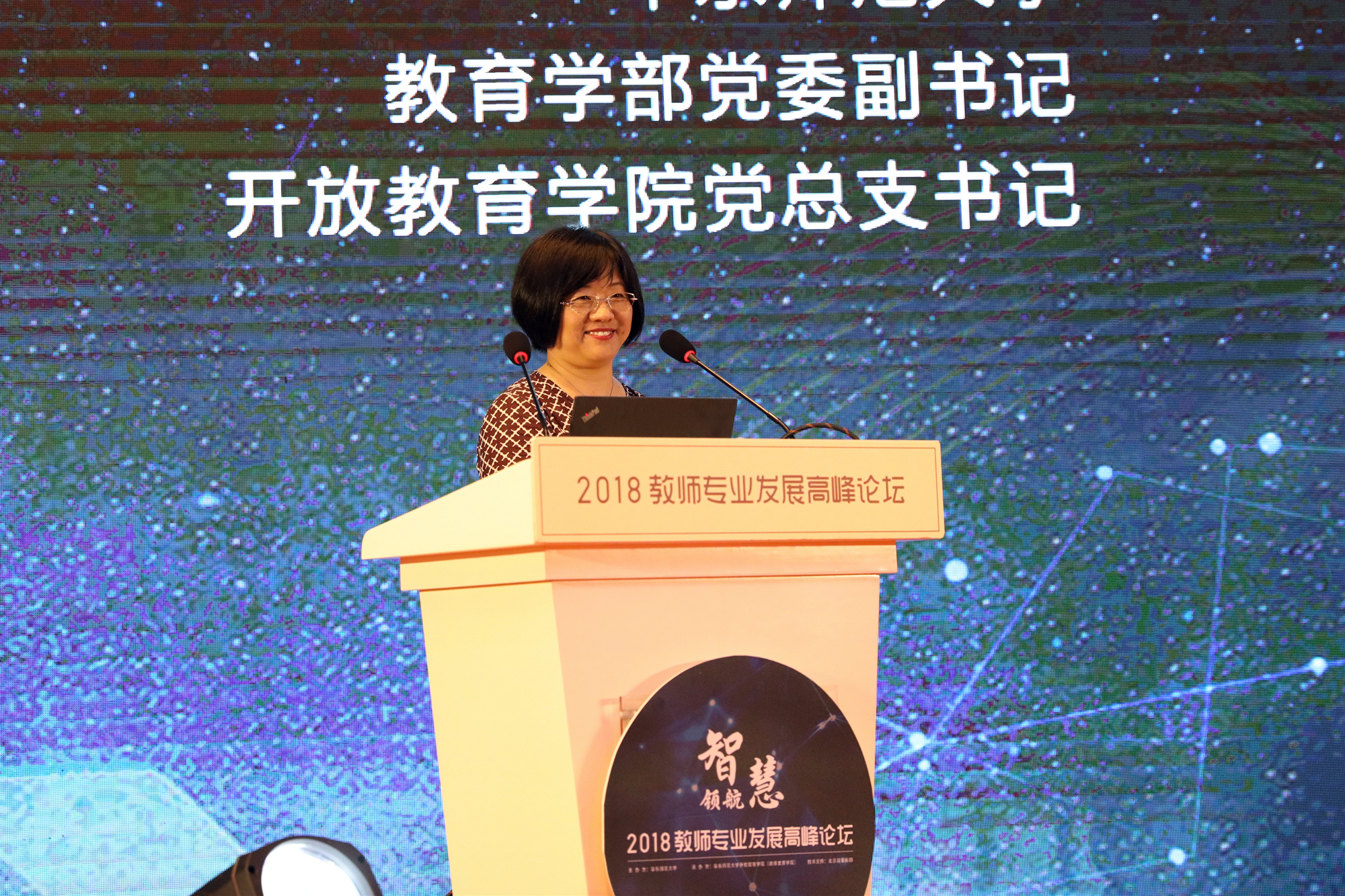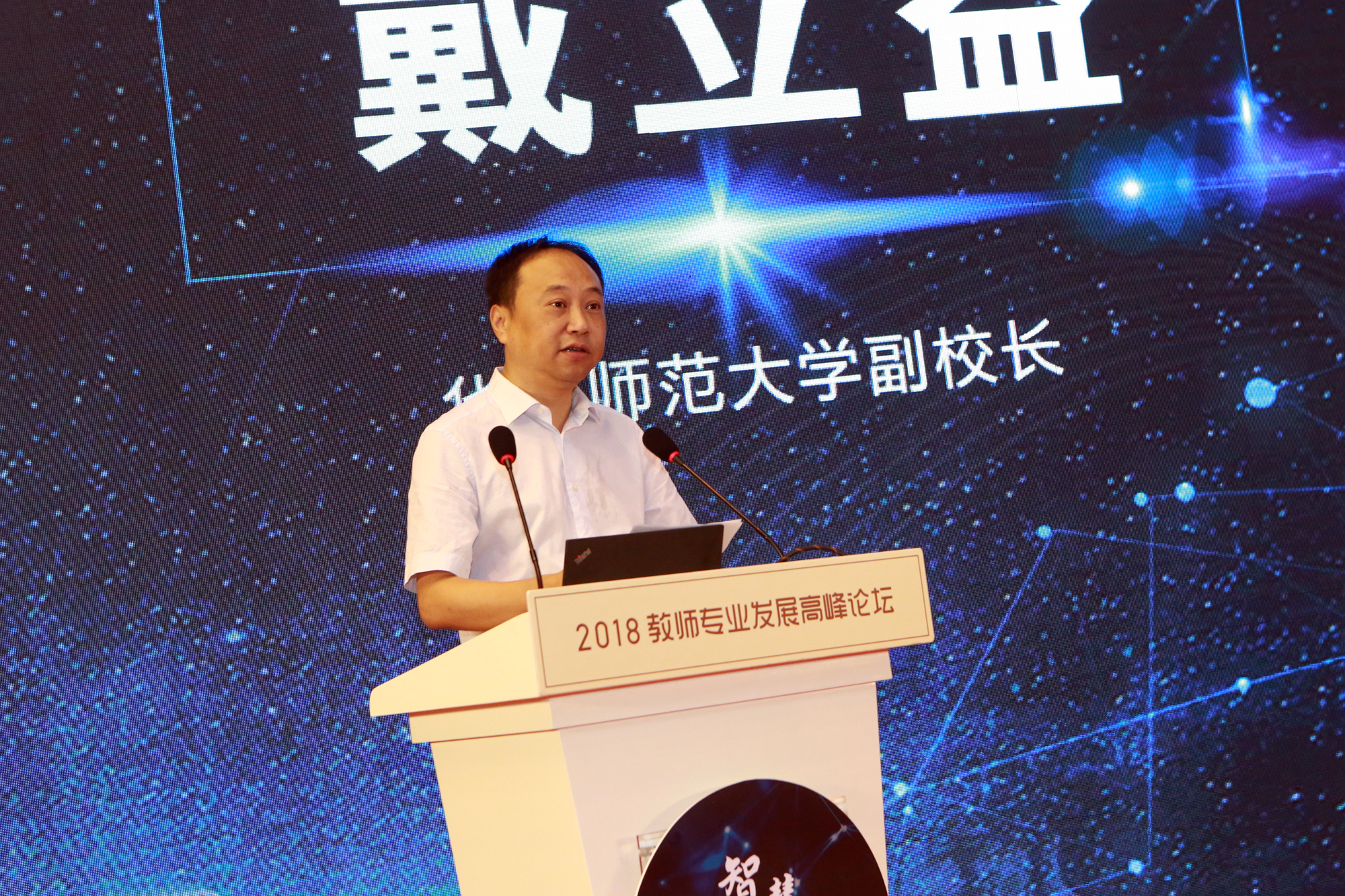 戴立益在致辞中对本次论坛的举行表示祝贺。他强调,“互联网+”中的“+”并不是简单的数学意义上的加法,而是化学意义上的化合与新生。日新月异的信息技术使教育从面向群体、以教育者为中心、以学科体系为出发点的封闭形态,逐步走向关注服务、以学习者为中心、以个性化需求为出发点的开放形态。这种质变的实现在更大程度上呼唤着协同创新和跨界融合。本次论坛充分见证和体现着这两种跨界融合,一是多元背景多种角色的论坛报告专家和参会人员共同谱写信息化背景下教师专业发展的新诗篇;二是论坛正式发布的两个重量级研究成果——师范生信息化教学能力标准和校本研修专业支持平台也是课程专家、学科教学专家、信息技术专家和一线名优教师围绕信息化和教师专业发展这两个关键词持续跨界协同研究的结晶。他期待今后在信息化助力教师专业发展事业上,各方能携手取得更大成就。
