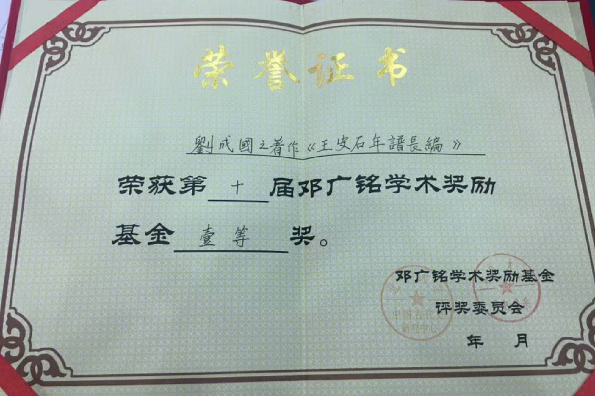 “邓广铭学术奖励基金”成立于1999年,由北京大学历史学系、北京大学中国古代史研究中心与中国宋史研究会共同设立,旨在奖励在辽宋夏金史研究方面有突出贡献的优秀中青年人才。“邓广铭学术奖励基金”每两年一届,迄今为止共举办十届,一等奖已连续几届空缺,刘成国的获奖,填补了该奖项一等奖多年的空缺。