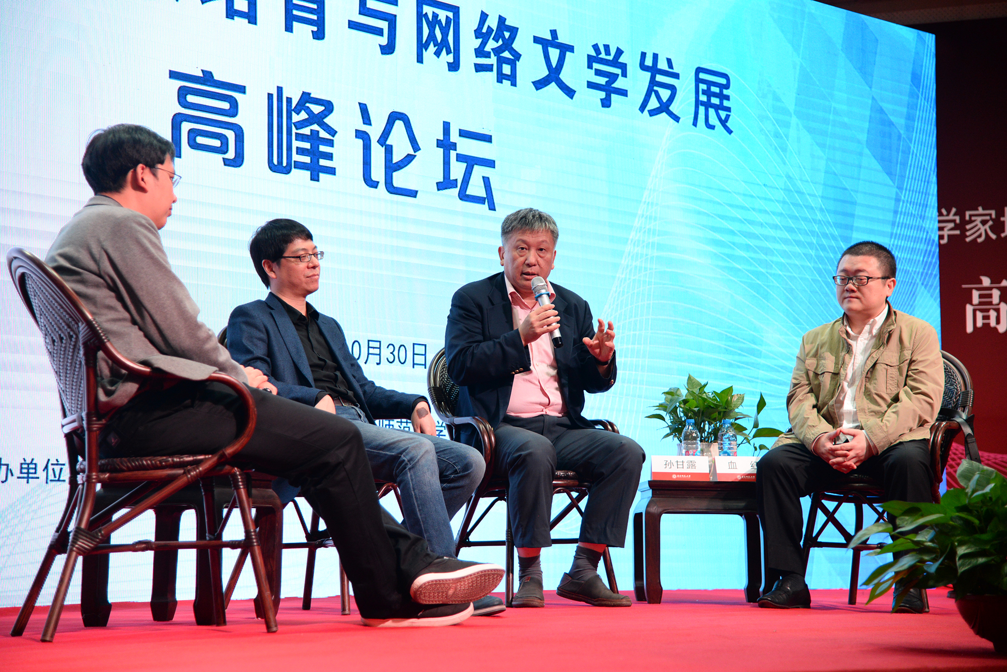 孙甘露在以“网络文学的阅读与写作”为题的发言中坦承,作为一个纸媒时代的写作者,他对于网络文学发展二十年所产生的庞大体量感到震惊。他认为,随着从纸张到网络这样书写媒介的转变,人类思考、写作的方式也发生了深刻的变化。因此,他提出网络文学应当放在一个广义的网络写作上来看,同时也要和网络技术、发明、传播这样一个总的框架内观察。就网络文学发展问题,夏烈以“造世界和梦工厂——网络文学发展引发的联系”为中心发表了他的看法。他指出,一时代有一时代之文学,网络文学代表这个时代的主流文学样式,带来的不是危机,而是契机,它给予人们跳出文学史固有观念与框架的一种可能,让人们重新思考文学的基本功能——文学要满足我们造梦的需求,而网络文学“虚拟+虚构”的特质使它成为一个造梦工厂。第二,他探讨了大学在其中承担的功能。现如今随着社会历史的发展,社会背景发生了变化,大学培养作家就有了其必要性和现实可能性。最后,夏烈还提到,知识分子对大众文化保持警惕有其必要性,但现代商业社会给文学带来的不仅是束缚,也有自由,因此要在其中寻求新的平台。血红的发言以“网络文学的高速发展呼唤更高素质的人才”为中心展开。他简单追溯了近20年来网络文学出版情况,表示网络文学要出现更多精品、更多经典还有更长的路要走,因为很多网络文学作者缺乏文学写作基本的知识储备和技巧训练,不只是写书,还包括如动画、漫画、游戏、影视、有声读物等领域都非常需要对网络文学有鉴赏力和评判力的人才,他表示华东师大成立中国创意写作研究院对写作人才的培养具有重要意义。