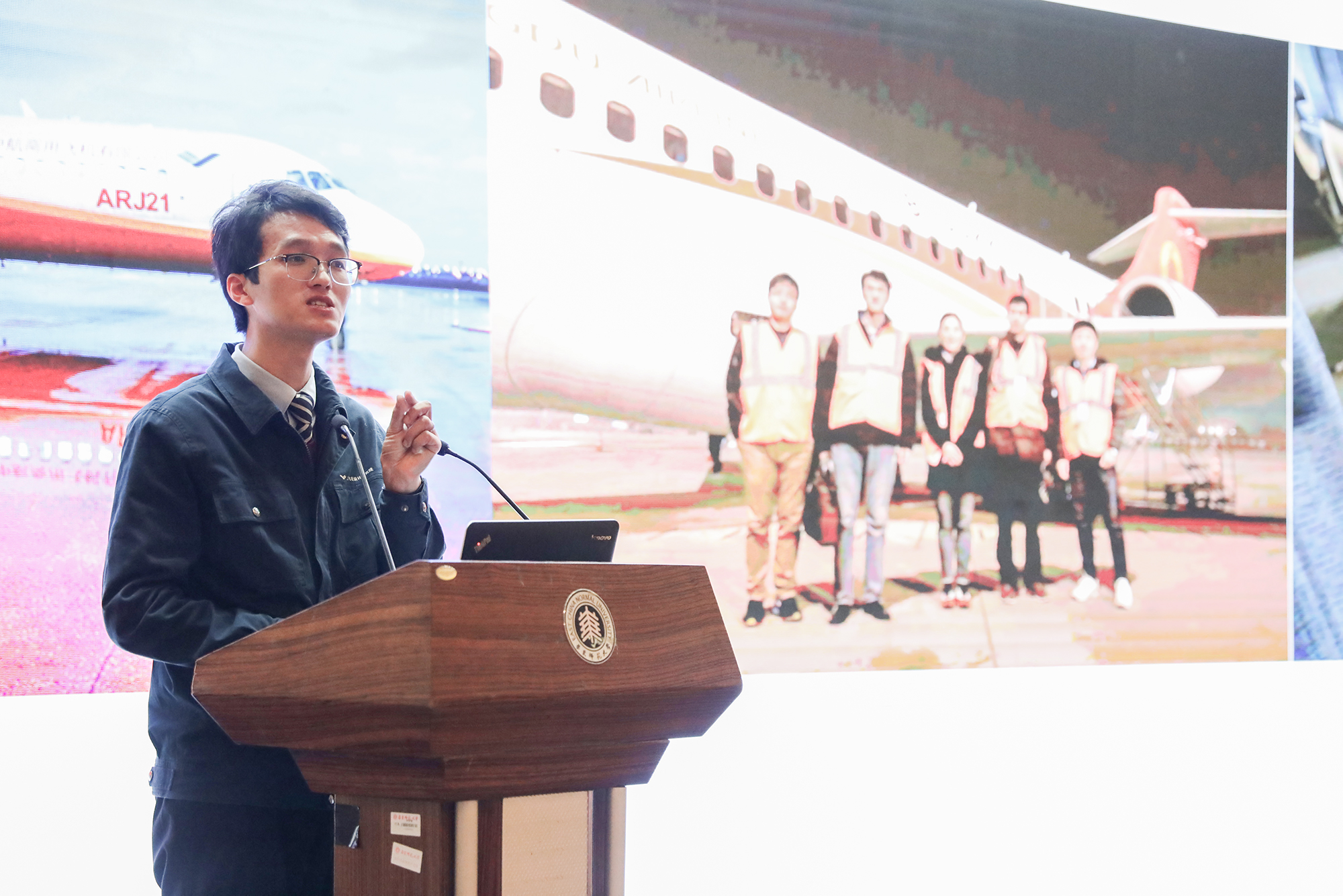 “大型商用飞机是现代工业技术皇冠上的明珠,是一个国家综合实力的体现。能研制大型商用飞机的国家代表着当今世界制造业的最高水平,代表着世界先进的科技、经济和资源水平。只有大国和强国才能进行大型商用飞机的制造。”飞机集成部高级工程师史剑锋用简洁的数据和富有动感的画面给同学们讲解了飞机的主要组成和机载系统,分析了大飞机的重大战略意义、大飞机产业的市场需求以及对于整个社会的产业带动作用。他在演讲的最后说道:“实现中华民族伟大复兴,是中华民族近代以来最伟大的梦想!大飞机梦是中国梦的一部分,我有幸承担这份责任,担当起这个使命,我想我们能够努力工作,牢记使命,也希望同学们牢记自己的历史使命。”