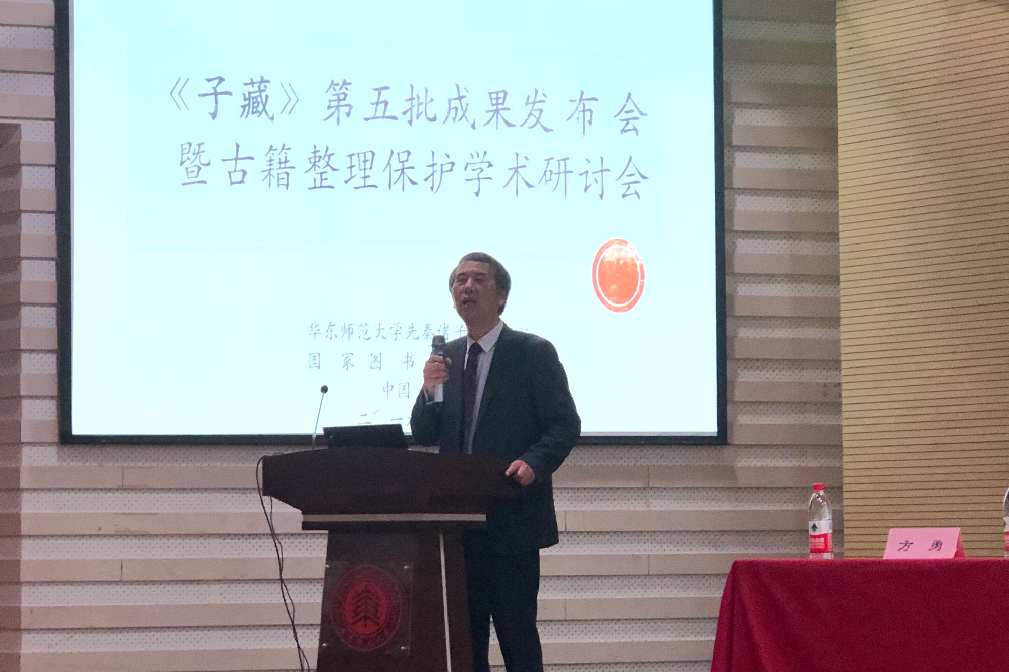 11月23日,《子藏》第五批成果发布会暨古籍整理保护学术研讨会在沪举行。本次大会由华东师范大学先秦诸子研究中心和国家图书馆出版社联合举办。国家图书馆副馆长、国家古籍保护中心副主任张志清,中国古籍保护协会副秘书长王红蕾,国家图书馆出版社副社长葛艳聪,台湾中国文化大学中文系副教授陈惠美,华东师范大学统战部部长、中文系党委书记王庆华,华东师范大学先秦诸子研究中心主任方勇教授,以及来自图书馆界、出版界和各高校的七十余位专家学者汇聚一堂,共同见证《子藏》第五批成果的发布,并围绕古籍的整理保护与研究、“《子藏》学”的建构等议题展开热烈讨论。