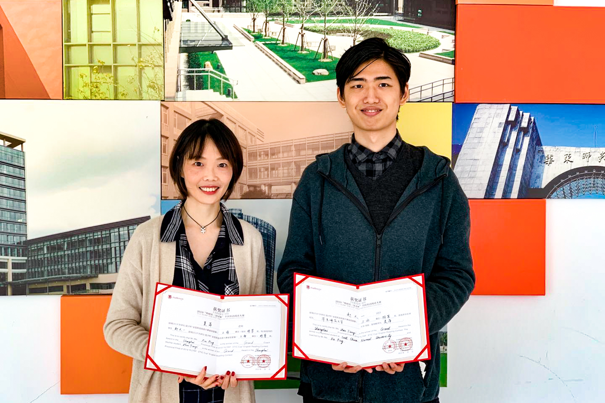演讲大赛上海赛区决赛特等奖获奖同学王嫣(右)与指导老师赵朝永(左)