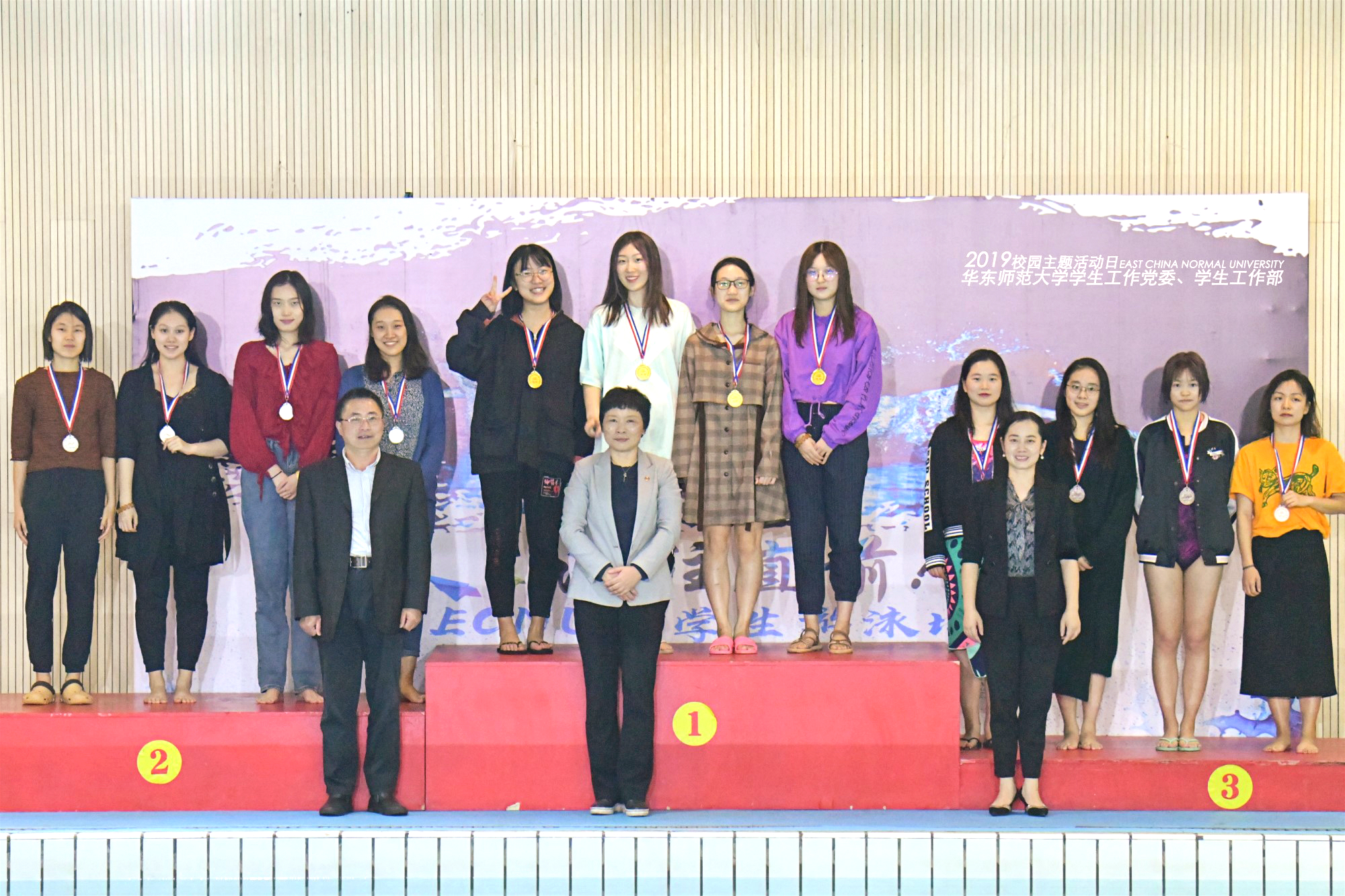 与此同时,第二届ECNU大学生游泳比赛决赛在闵行校区体育与健康学院游泳馆紧锣密鼓地进行。本次决赛共设置9个竞赛项目,分为个人赛和团体赛,较去年新增了男子25米自由泳、蛙泳和女子50米自由泳、蛙泳等4个项目,吸引了百余名学生参加比赛。经过紧张的角逐,经济与管理学部、地理科学学院、光华书院分别荣获团体奖的冠、亚、季军。校党委副书记杨昌利观摩游泳比赛并为获奖者颁奖,她鼓励同学们把“健康学习、健康生活、运动校园”的理念贯穿在日常的学习生活中,使运动成为日常习惯,积极参加体育锻炼,发扬运动精神和团队精神,以更加饱满的状态投入到学习和实践中,与学校同发展、共成长。