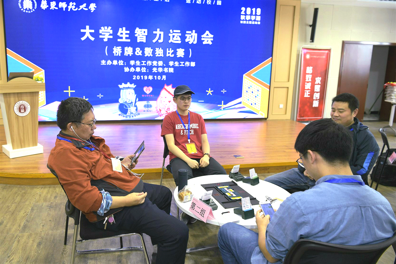 为了进一步锻炼同学们的逻辑思维能力、培养合作精神、丰富数学教育文化内涵,学校推出首届大学生智力运动会——桥牌、数独比赛。本届智力运动会也得到了四季教育集团的大力支持。今年,近200名学生参赛。数独决赛在2个赛场同时进行,场上同学们大脑高速运转、聚精会神盯着试题,争分夺秒。桥牌比赛采用固定搭配、现场随机搭配、校友彩蛋搭配的方式进行比赛,共有24人参赛,分为6组,团体博弈,搭建了结识新朋友、增进了解和友谊的桥梁。校党委副书记杨昌利、四季教育集团副总何乐华等分别为获奖者颁奖。杨昌利在致辞中表达了对同学们的殷切期盼,她期望借智力运动会之契机,使智力运动在华东师大校园生根发芽,茁壮成长,希望未来在全国乃至世界的智力类赛事上,看到华东师大学子的身影。