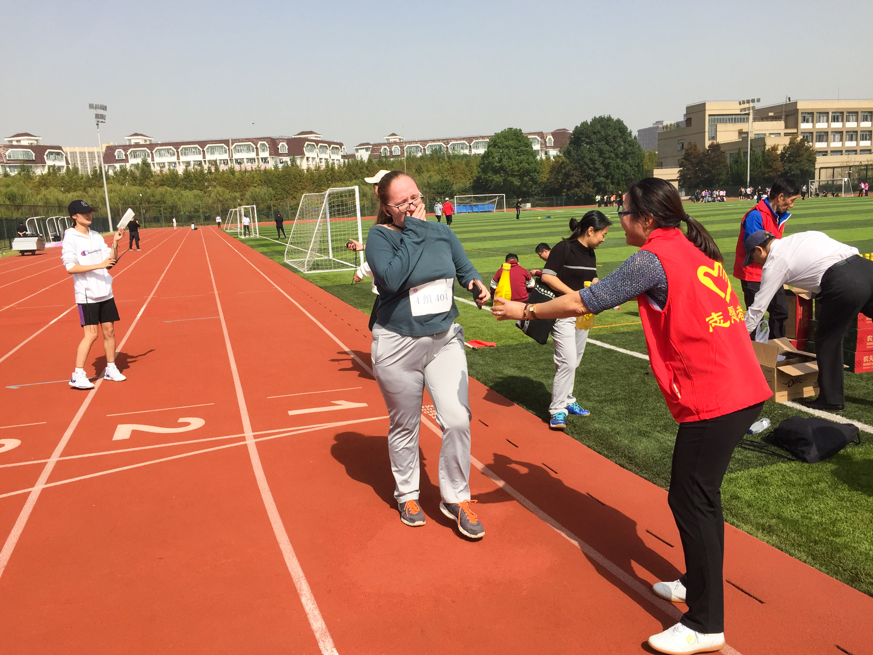 运动场上,运动员们精神抖擞,士气高涨。啦啦队加油助威声此起彼伏,络绎不绝。他们积极拼搏,团结互助的凝聚力在此时体现的淋漓尽致。除此之外,还有一道靓丽的风景线格外的吸人眼球,有一群穿着红马甲的志愿者们分布在每一项比赛场地中,他们关心着每位运动员的身体状况,及时为运动员递上所需的能量补充食物,帮助运动员的状态得到迅速恢复。