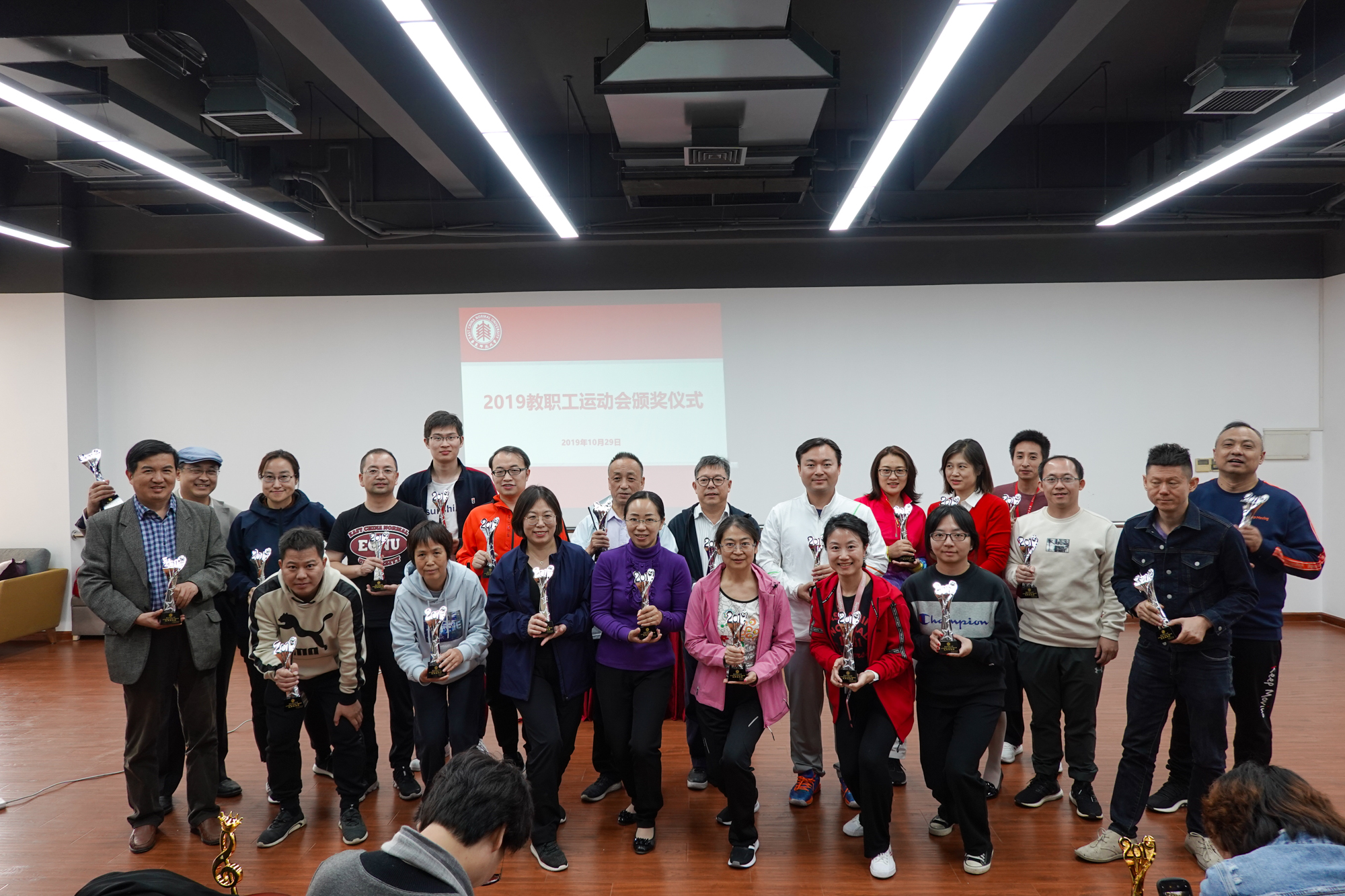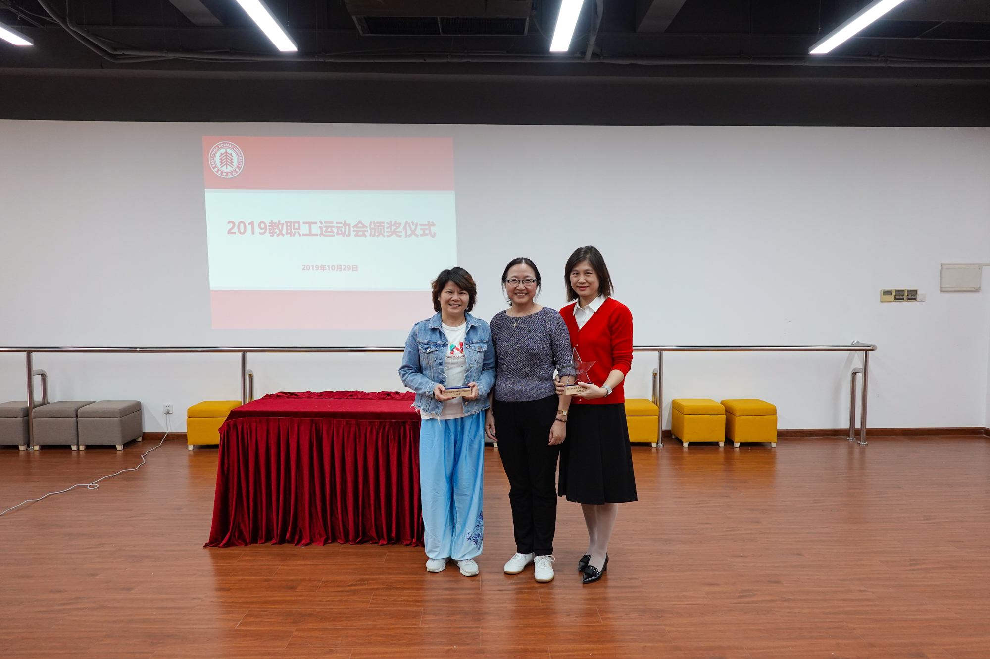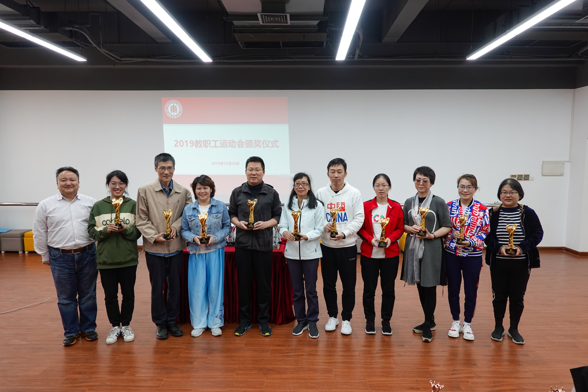 经过半天激烈的角逐,各个奖项都“名花有主”。当天中午,校工会在学生之家A307举行了教工运动会颁奖仪式。王平首先揭晓了广播操比赛结果,李小英为获奖单位颁发了奖杯。机关行政二、教育学部、产业、心理与认知科学学院、机关行政一、孟宪承、大夏、光华联合书院、数学科学学院、生态与环境科学学院、外语学院、后勤保障部获2019年校教职工运动会广播操比赛最佳表演奖,图书馆、生命科学学院、二附中、社会发展学院、出版社等25个部门工会获了播操比赛优秀表演奖。