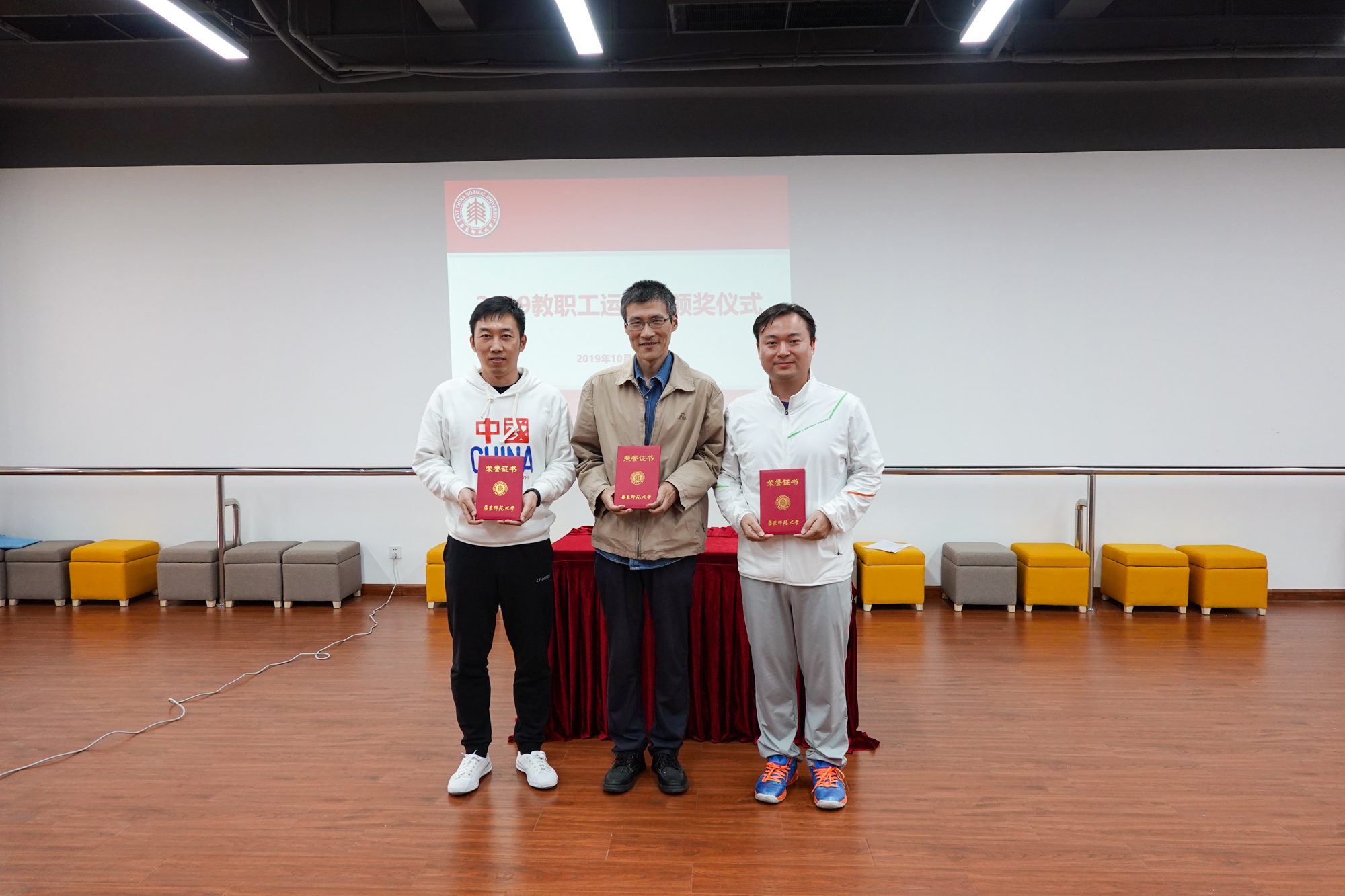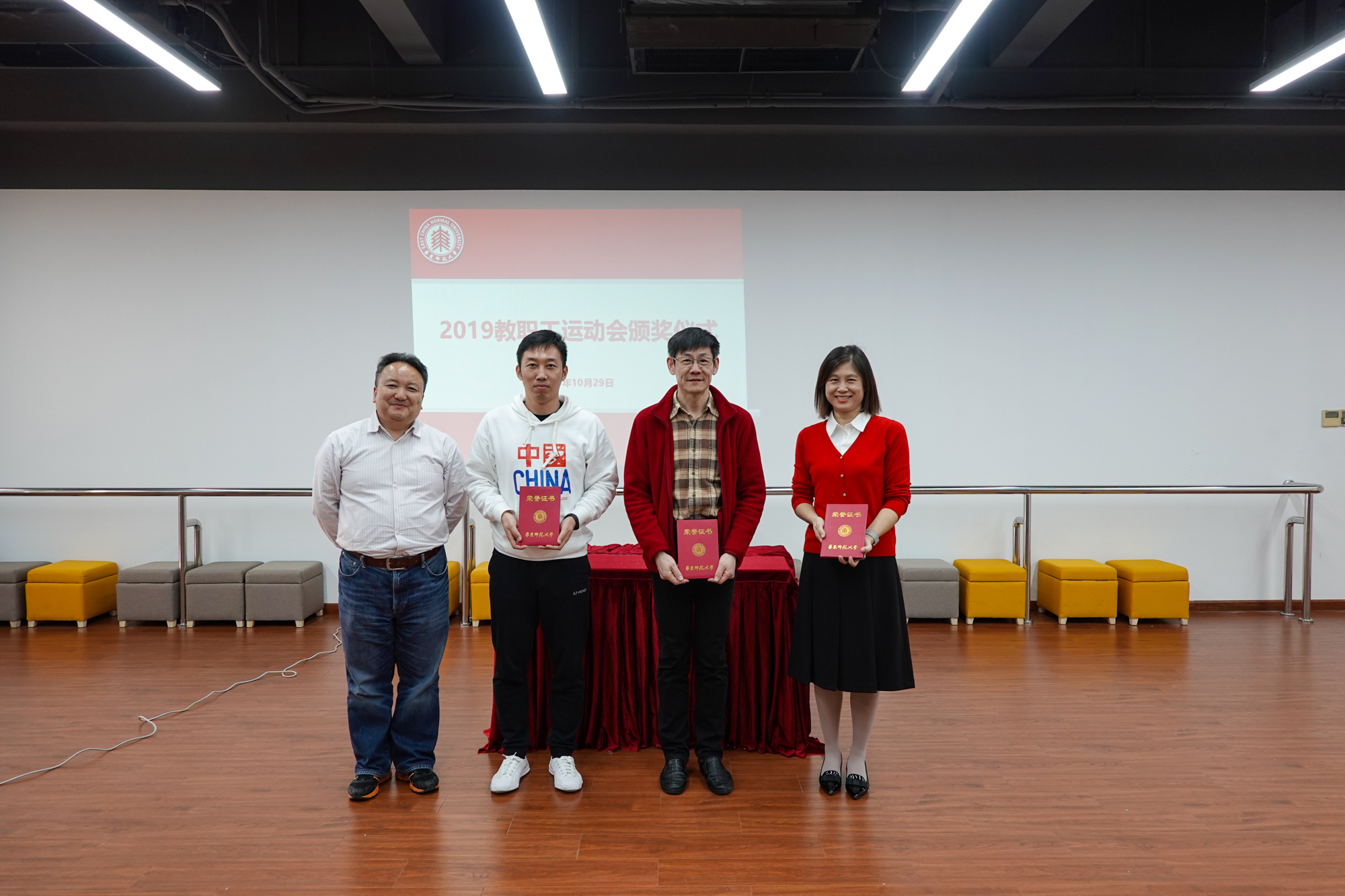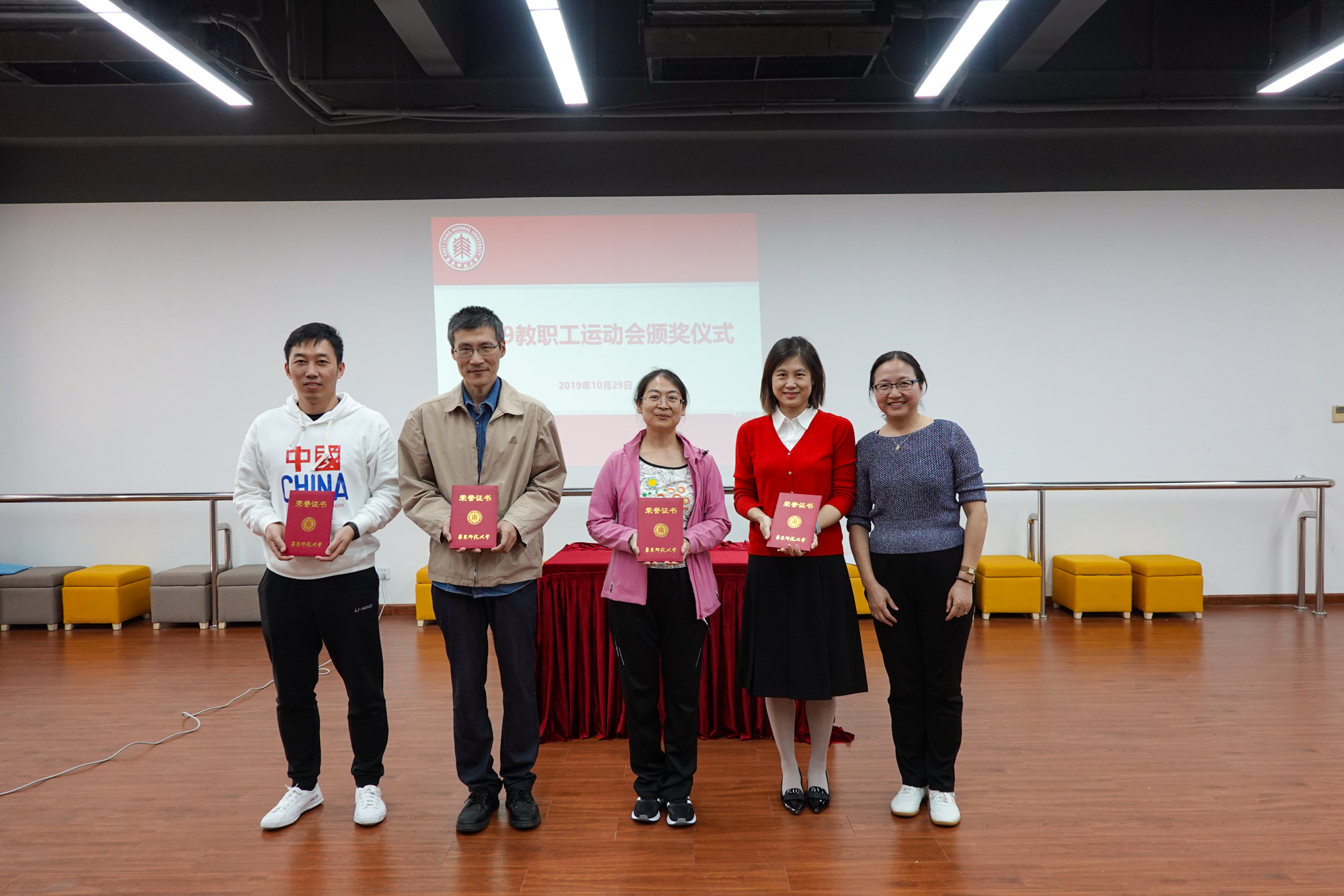 经过半天激烈的角逐,各个奖项都“名花有主”。当天中午,校工会在学生之家A307举行了教工运动会颁奖仪式。王平首先揭晓了广播操比赛结果,李小英为获奖单位颁发了奖杯。机关行政二、教育学部、产业、心理与认知科学学院、机关行政一、孟宪承、大夏、光华联合书院、数学科学学院、生态与环境科学学院、外语学院、后勤保障部获2019年校教职工运动会广播操比赛最佳表演奖,图书馆、生命科学学院、二附中、社会发展学院、出版社等25个部门工会获了播操比赛优秀表演奖。