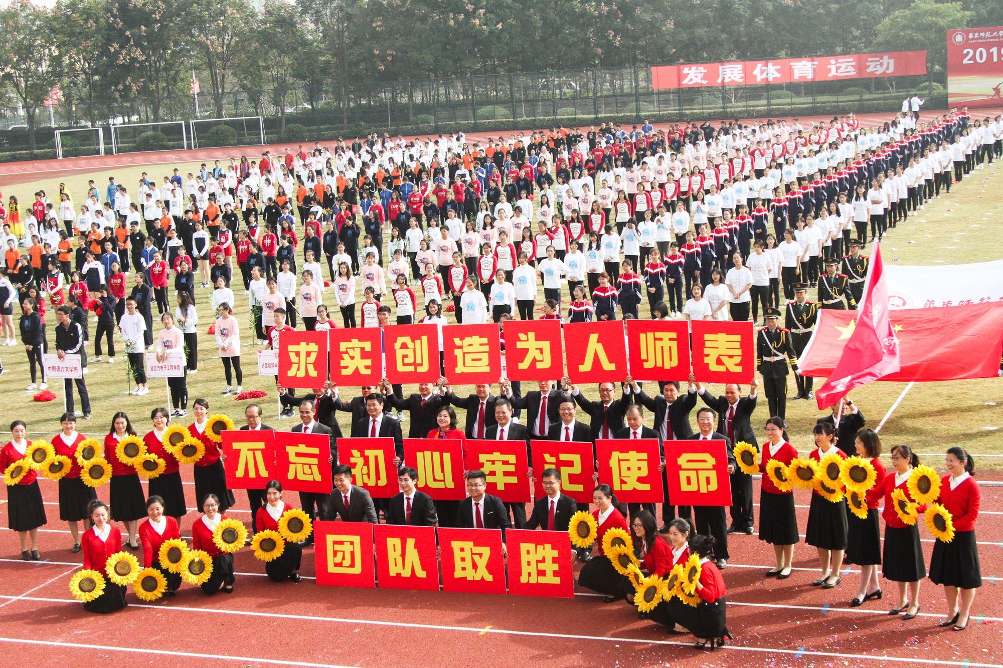 开幕式上,最后一支方阵是由经管学部的老师们组成,一片片向日葵簇拥着“不忘初心、牢记使命、求实创造、为人师表”的字样,赢得了全场热烈的掌声。教职工在运动会开幕式上进行了第九套广播操比赛和百人太极拳展示。随后在西操场举行了篮球定点投篮、跳短绳和健康长跑赛项目。