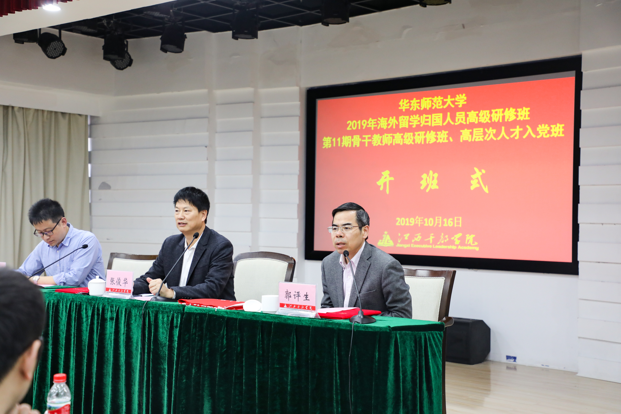 为深入学习贯彻习近平新时代中国特色社会主义思想,切实落实《2018-2022年全国干部教育规划》,扎实开展“不忘初心、牢记使命”主题教育,同时进一步拓宽培训平台,推动培训资源共建共享,提升我校党校教育培训水平,10月16-20日,我校在江西干部学院举行了党校教育培训基地签约仪式,并组织第11期骨干教师高级研修班、2019年海外留学归国人员高级研修班、高层次人才入党班学员开展了为期5天的现场教学,党校(高级研修学院)及党委教师工作部相关人员参与了本次教学活动。江西干部学院院长郭评生、华东师大党校副校长兼高级研修学院副院长张俊华出席开班式。