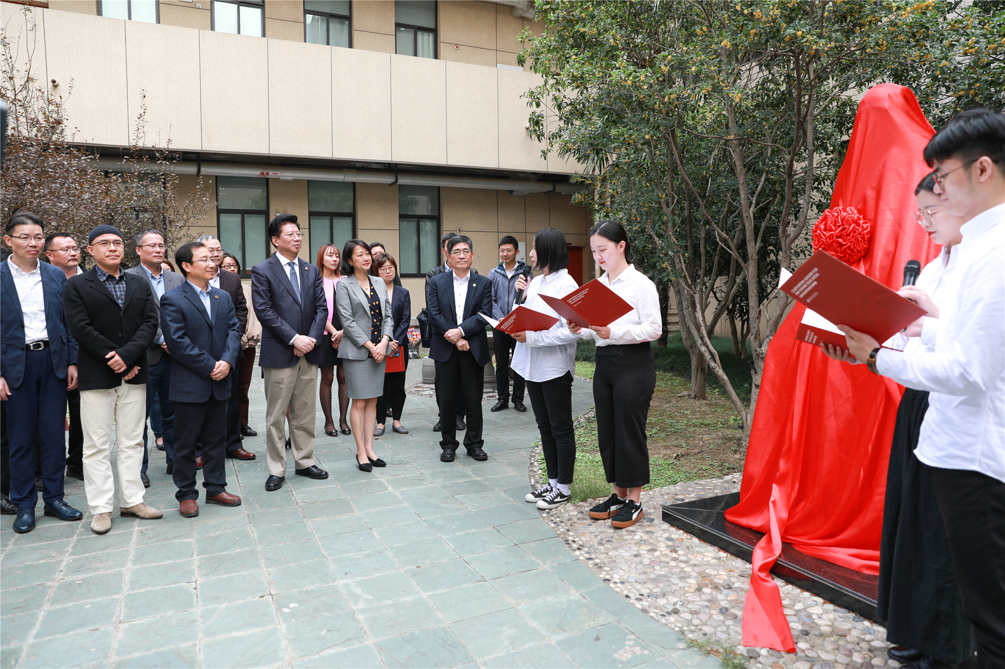 随后,与会人员移步至文科大楼中庭,举办了简短而隆重的刘佛年雕像揭幕仪式。2019级“佛年班”同学们通过原创诗朗诵《传承佛年志》表达了对刘佛年校长的缅怀和纪念。诗歌讲述了刘佛年校长寒窗苦读、辗转求学、涵育英才、改革创新的人生历程,以及他追求真理、鞠躬尽瘁、胸怀天下的教育家精神,表达了新一代“佛年人”“求实求精,求活求新,做未来教育的领导者”的决心。胡卫与童世骏共同为刘佛年雕像揭幕,“佛年班”学生代表向刘佛年雕像献上鲜花。