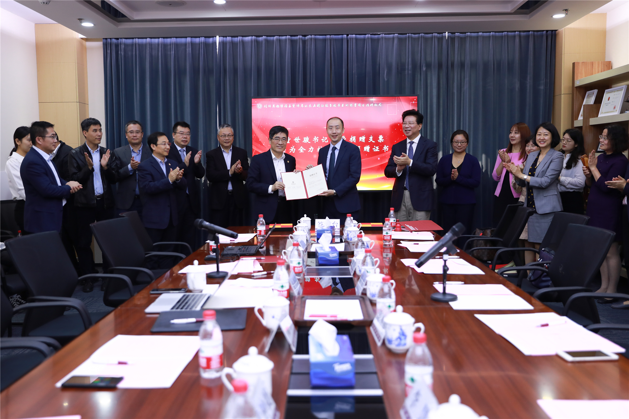 随后,陈杰妮与斯阳在双方人员的共同见证下,签订了捐赠协议。本次捐赠总额达180万元,为期三年。全力将首期捐赠支票交到了童世骏手中,童世骏向全力颁发捐赠证书。