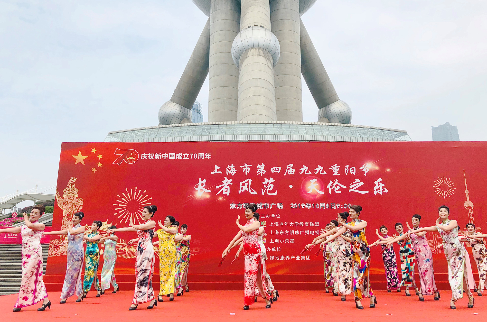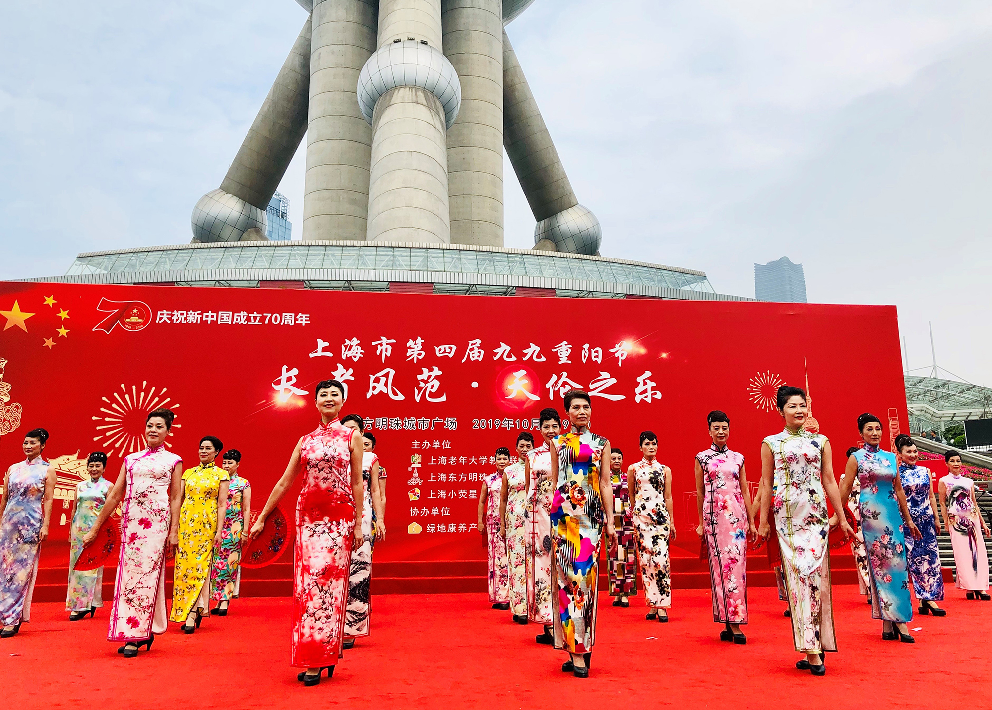 在东方明珠广播电视塔下的城市广场上,上海老年大学教育联盟与上海小荧星艺术团联合演出了21个文艺节目。白发老者、快乐孩童,大手携小手,欢度国庆,喜迎重阳。他们表达着同一个主题——庆祝新中国成立70周年。在展演活动中,我校老年大学丽娃旗袍队的《大美中华》作为开场节目表演了精品旗袍秀,在恢弘大气的音乐中,老年学员们仿佛从百年旗袍的历史中翩翩走来。一袭旗袍,一把红扇,不经意间,穿越在古典与现代之间。举手投足之间展示出婀娜多姿,转身展扇刹那间,含蓄中带有一份坚定,尽显她们对伟大祖国的爱国情怀。她们曼妙的身姿和优雅的舞步展现了海派旗袍文化的魅力,赢得了台下嘉宾和观众们的阵阵掌声。