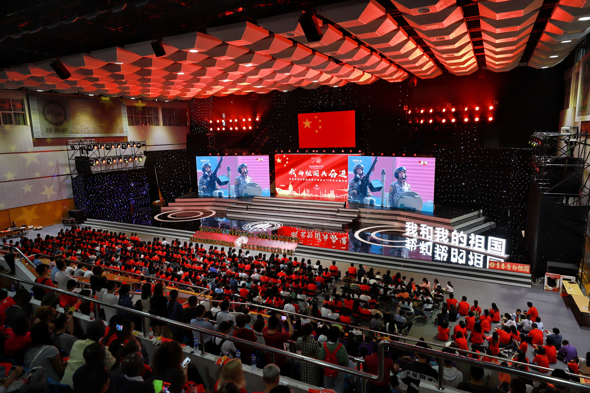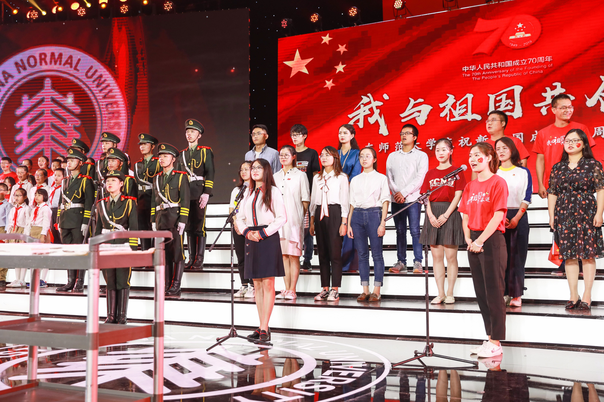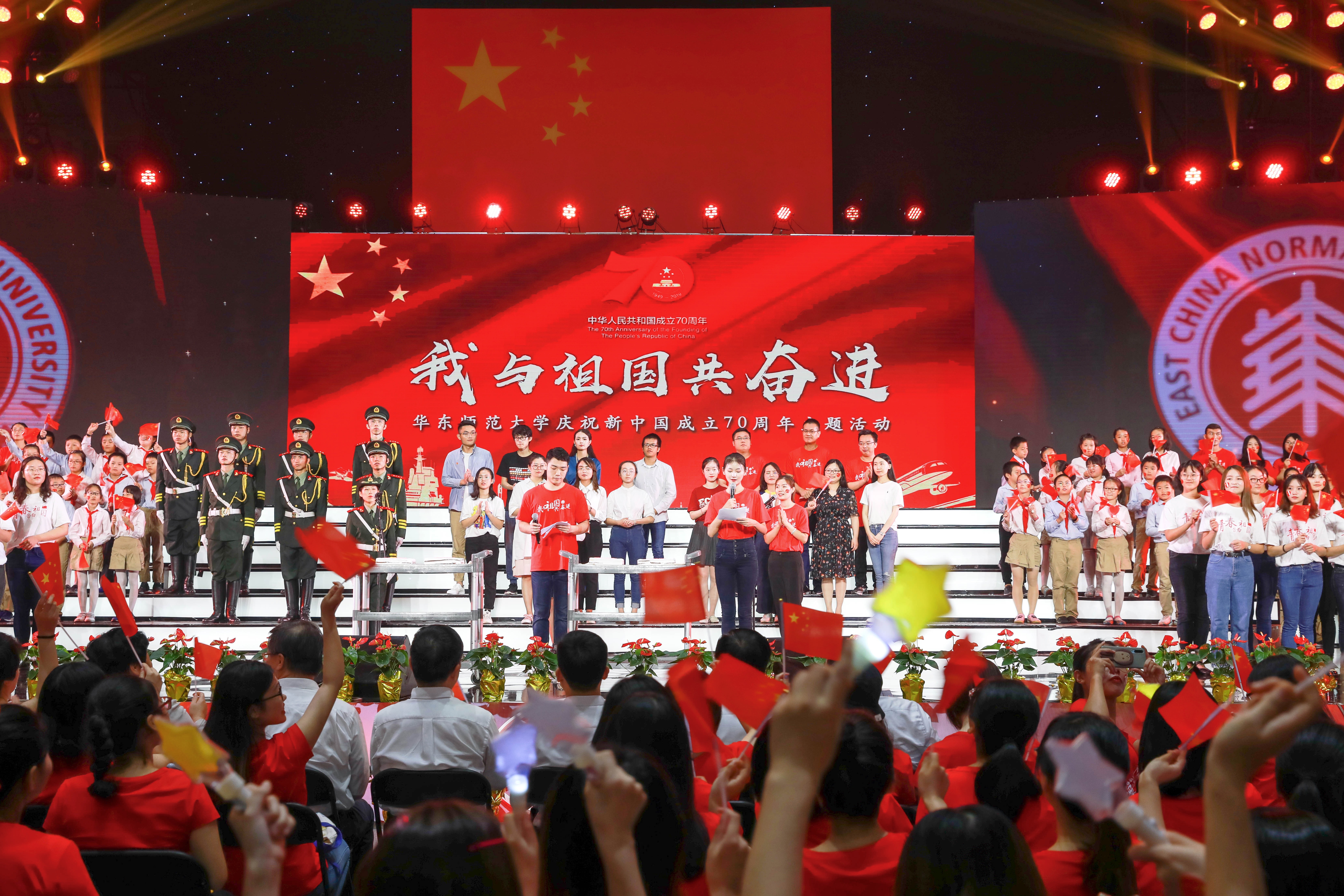 今天,新中国迎来七十华诞,华东师大师生在中山北路校区体育馆隆重举行“我与祖国共奋进·庆祝新中国成立70周年”主题活动。盛世如今,唱响礼赞新中国、奋进新时代的青春主旋律。