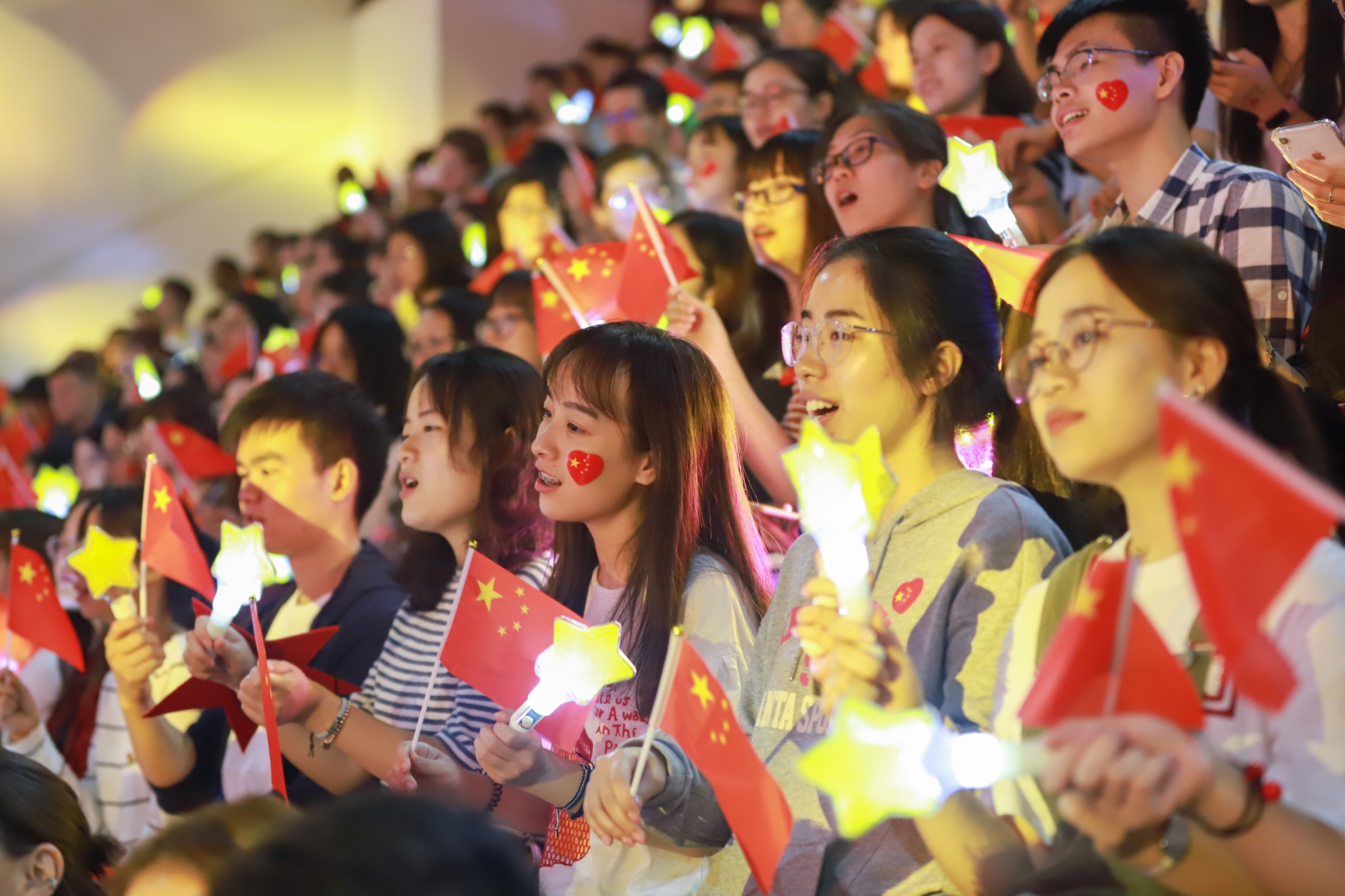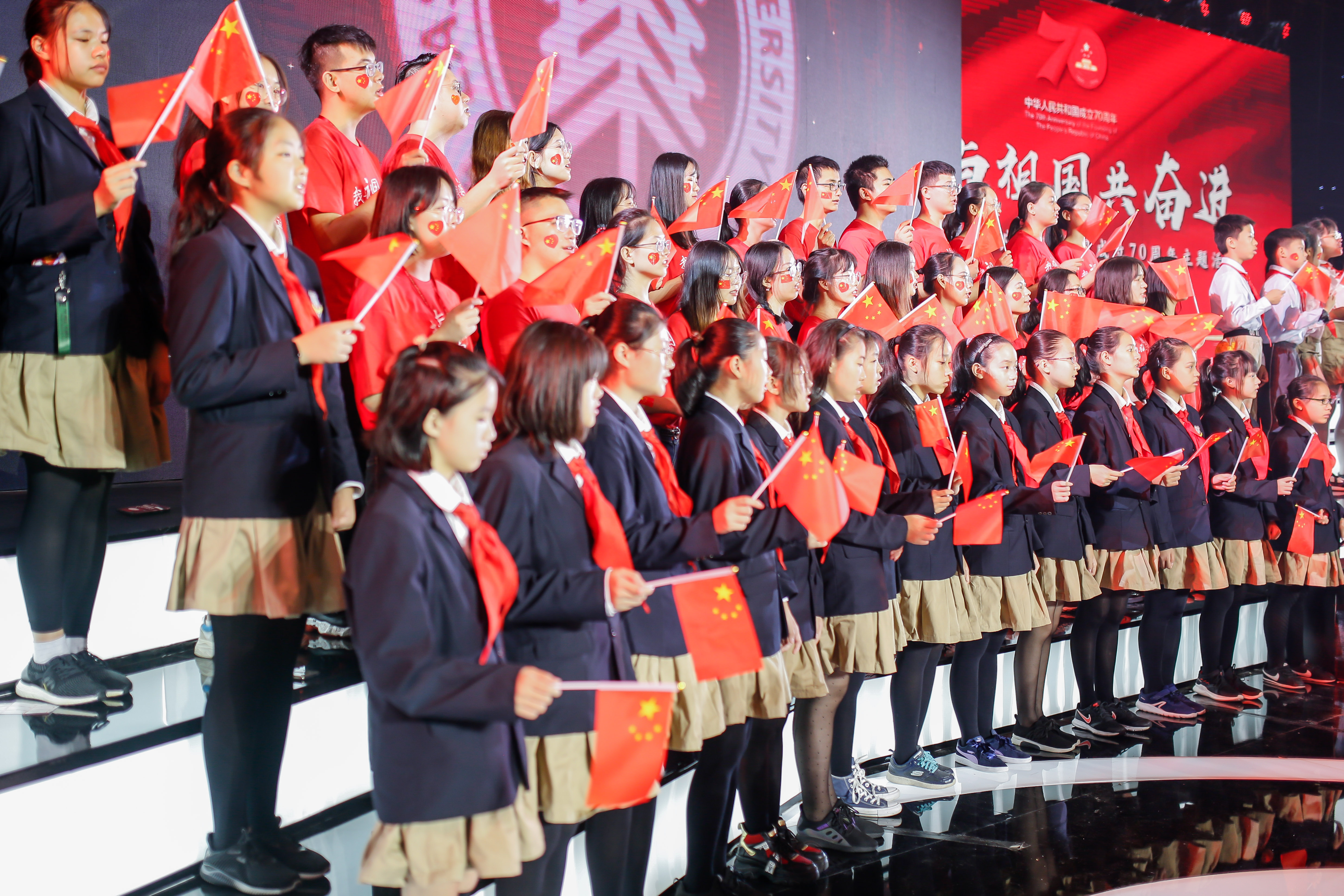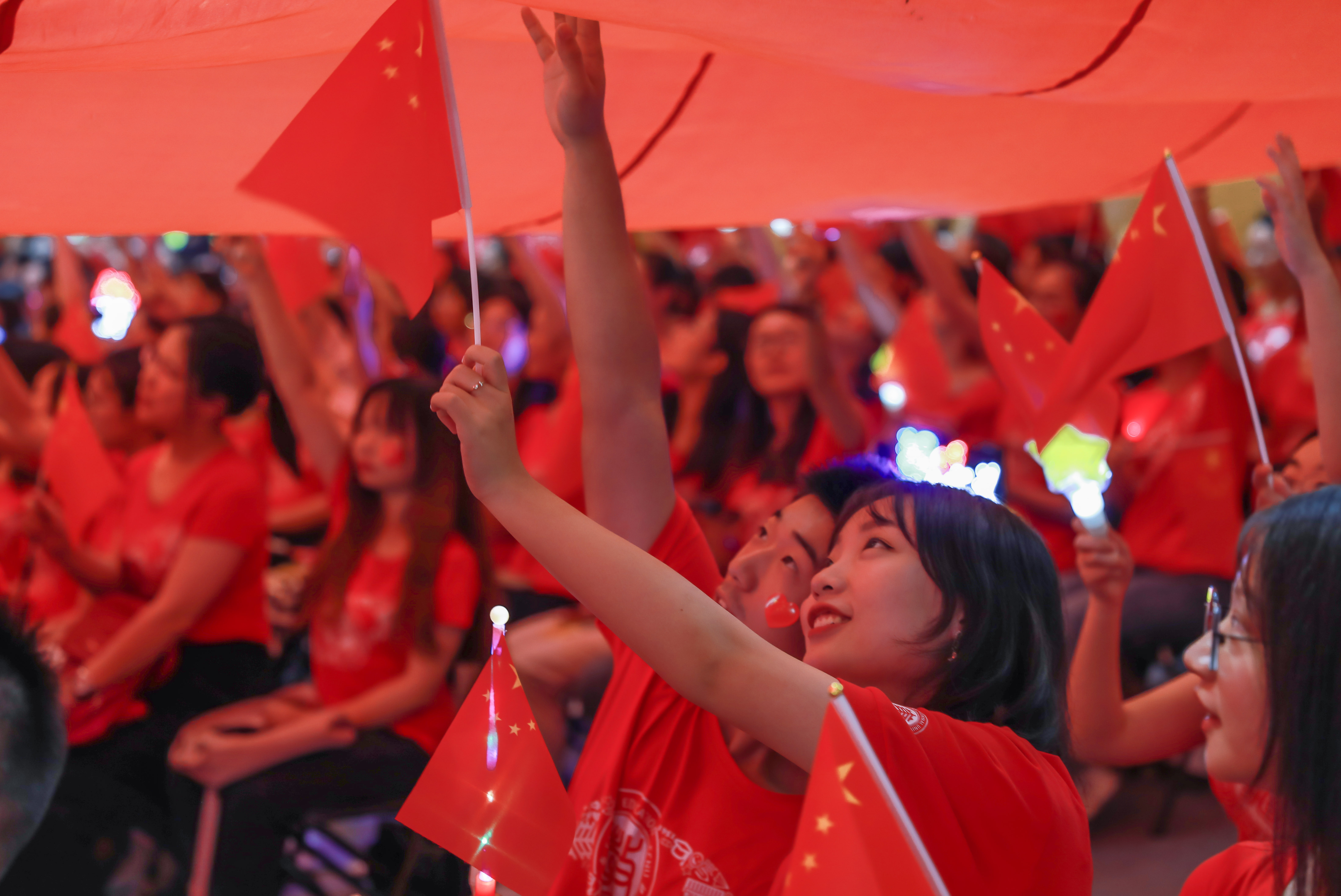 歌声中、欢呼声中,全场师生轻舞手中的国旗,一面巨幅国旗徐徐展开。从高处望去,一片热闹的鲜红在现场翻涌,如同师生心头澎湃的热血,这一抹抹中国红应是这个秋天最美的风景。