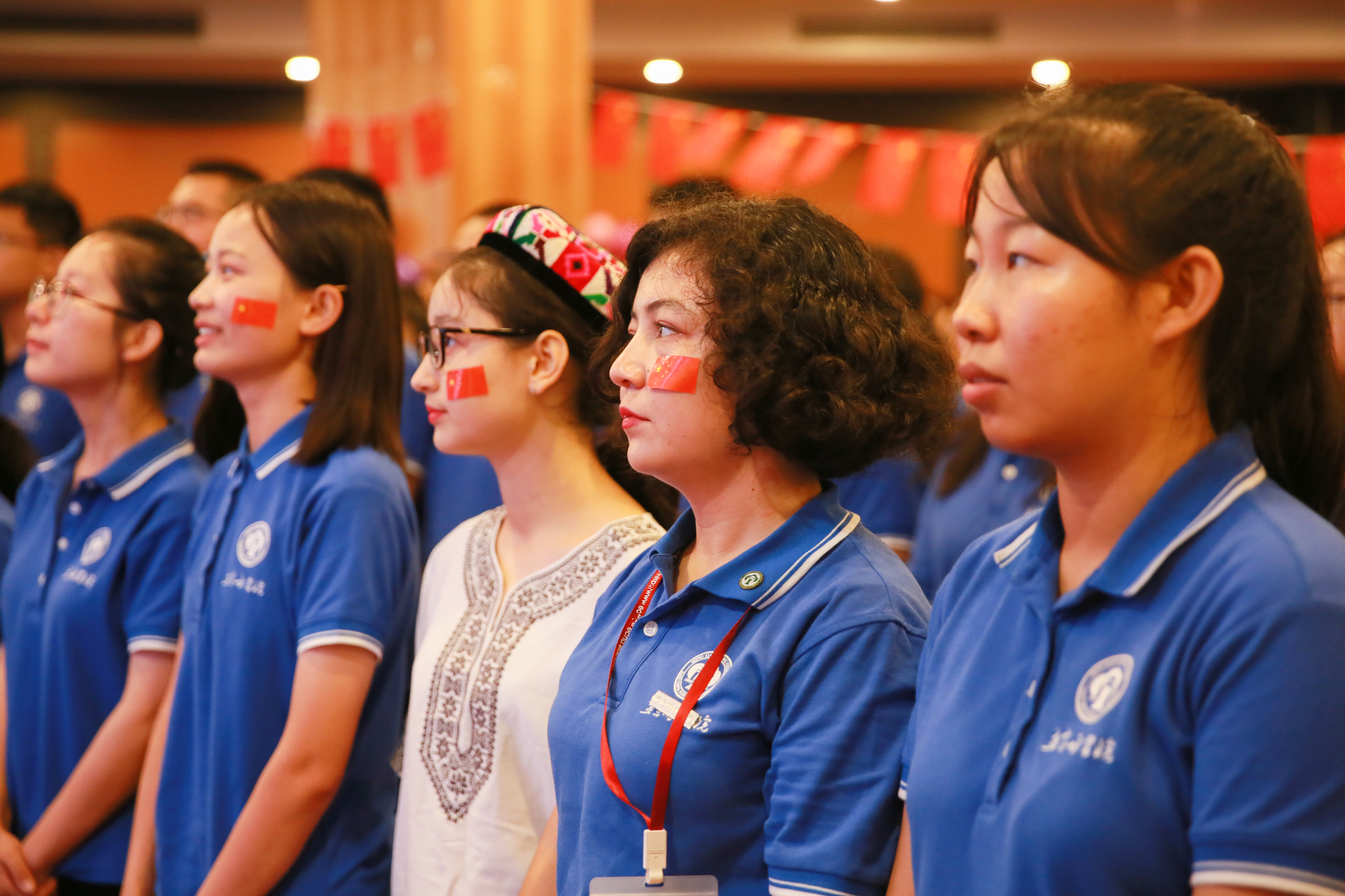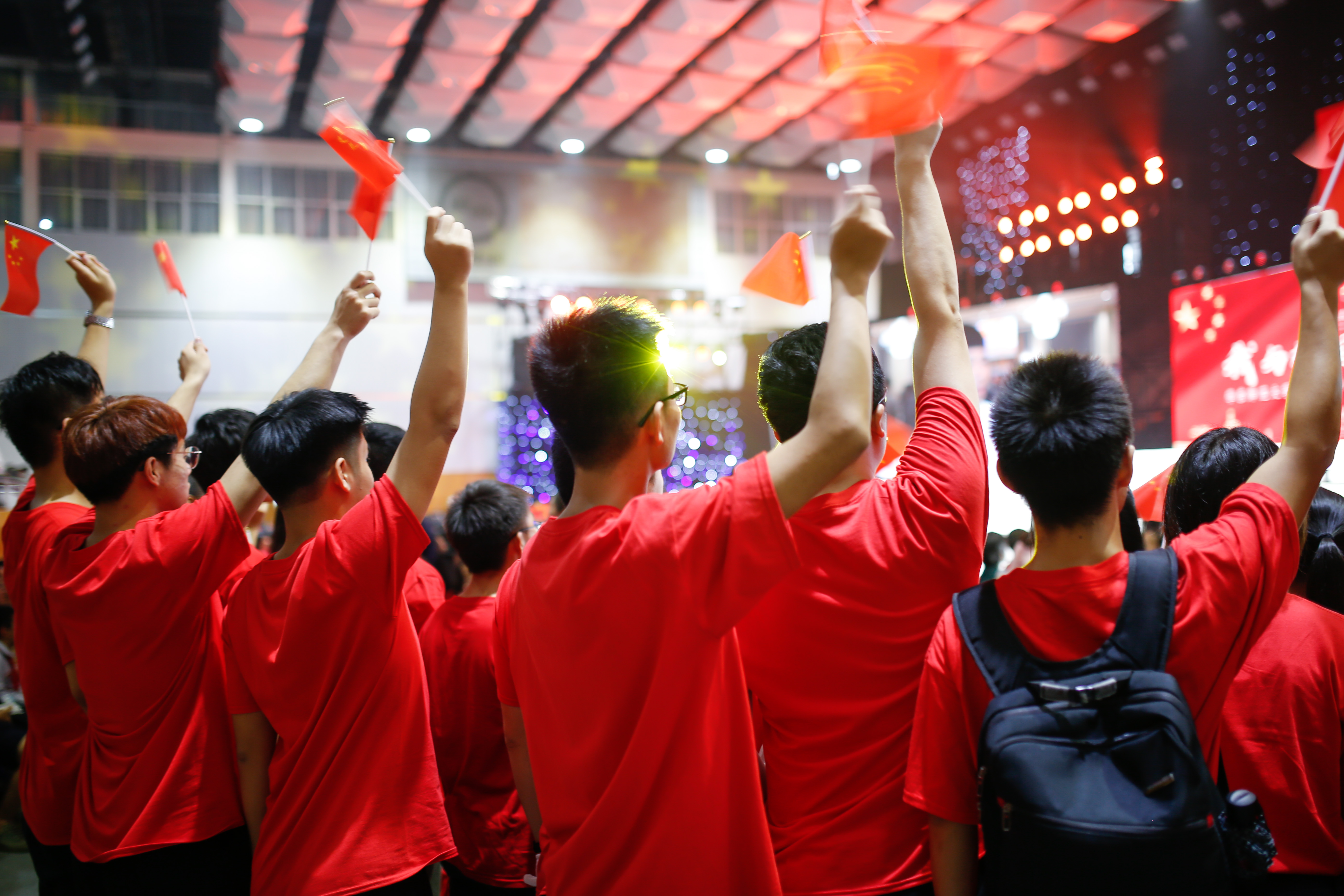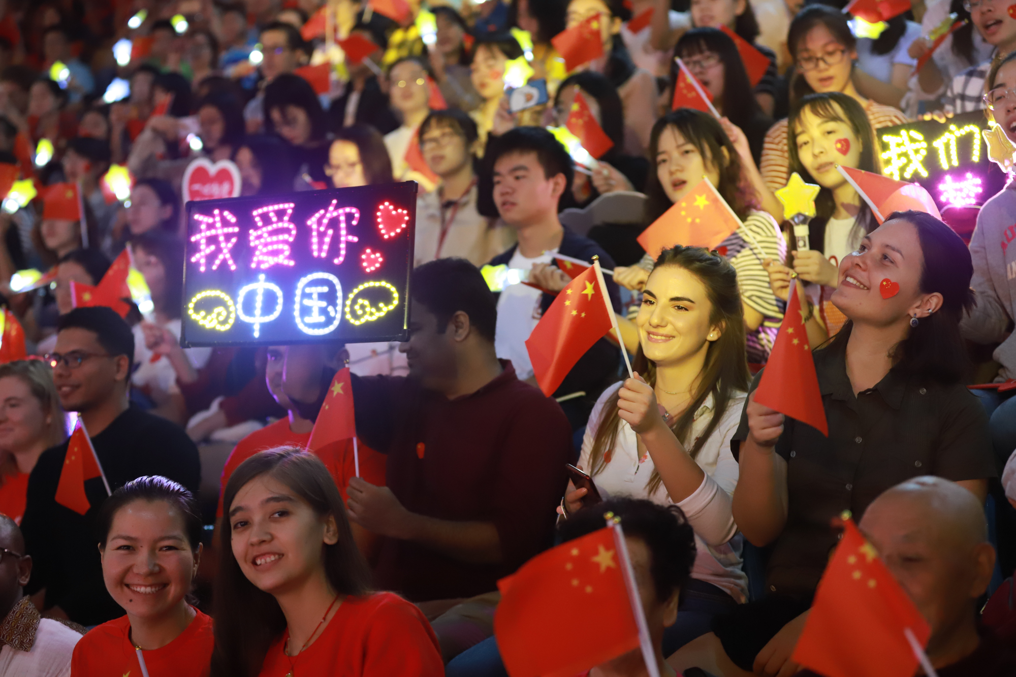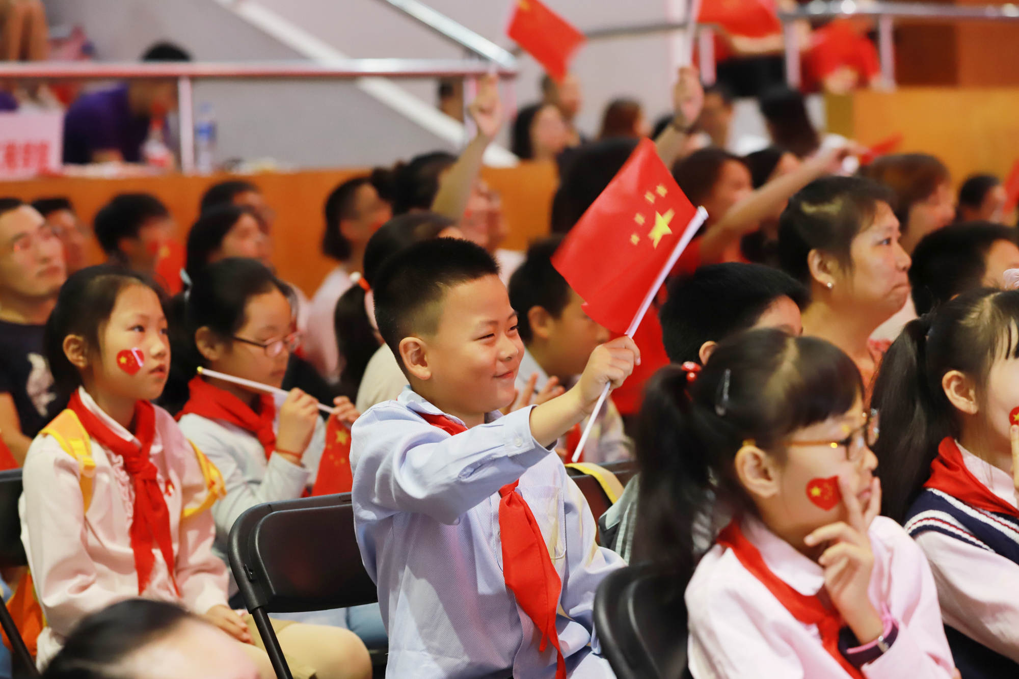 歌声中、欢呼声中,全场师生轻舞手中的国旗,一面巨幅国旗徐徐展开。从高处望去,一片热闹的鲜红在现场翻涌,如同师生心头澎湃的热血,这一抹抹中国红应是这个秋天最美的风景。