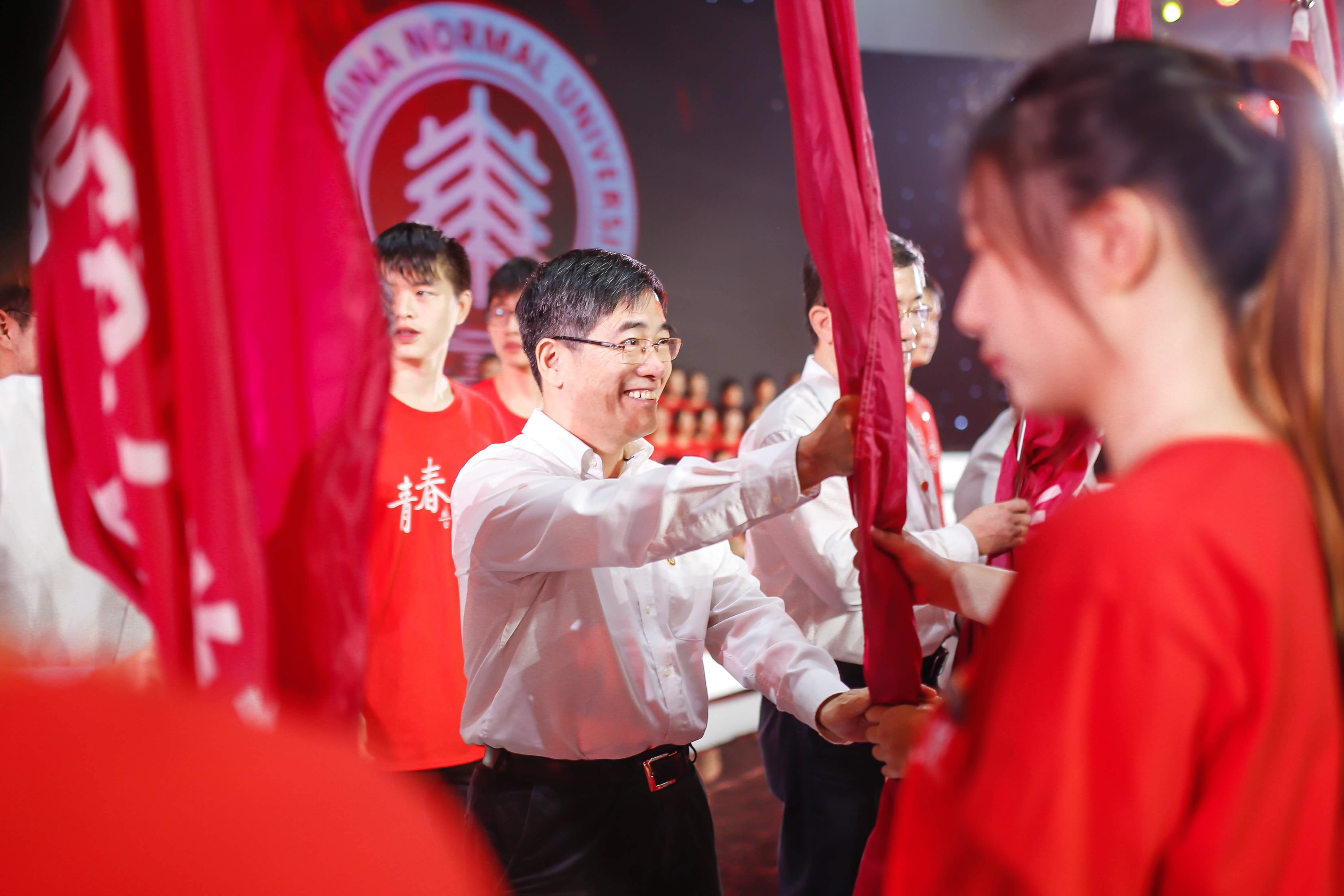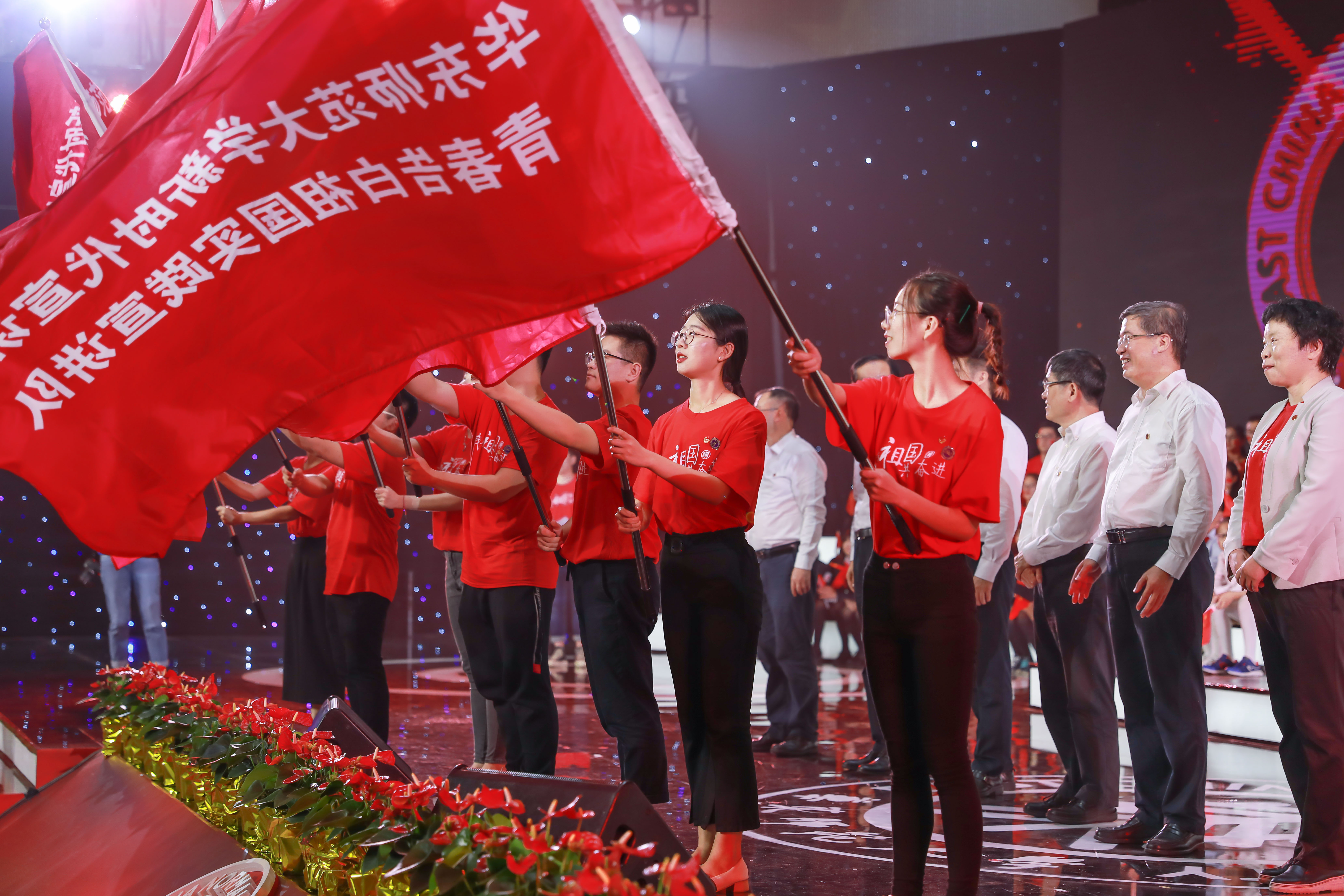 现场,校党委书记童世骏等校领导班子成员为“华东师范大学新时代宣讲团——青春告白祖国实践宣讲队”授旗。该宣讲团依托马克思主义理论学科建设、中国特色社会主义理论体系研究,推进理论研究与青年社会实践紧密结合,深入基层社区、企事业单位、中小学和农村开展新时代新思想主题宣讲。青春告白祖国实践宣讲队将通过主题团日、社会实践、志愿服务等多种形式覆盖全校团员青年,以实践助推青春梦想,以昂扬的精神面貌、坚定的前进力量向新中国70周年华诞献礼。