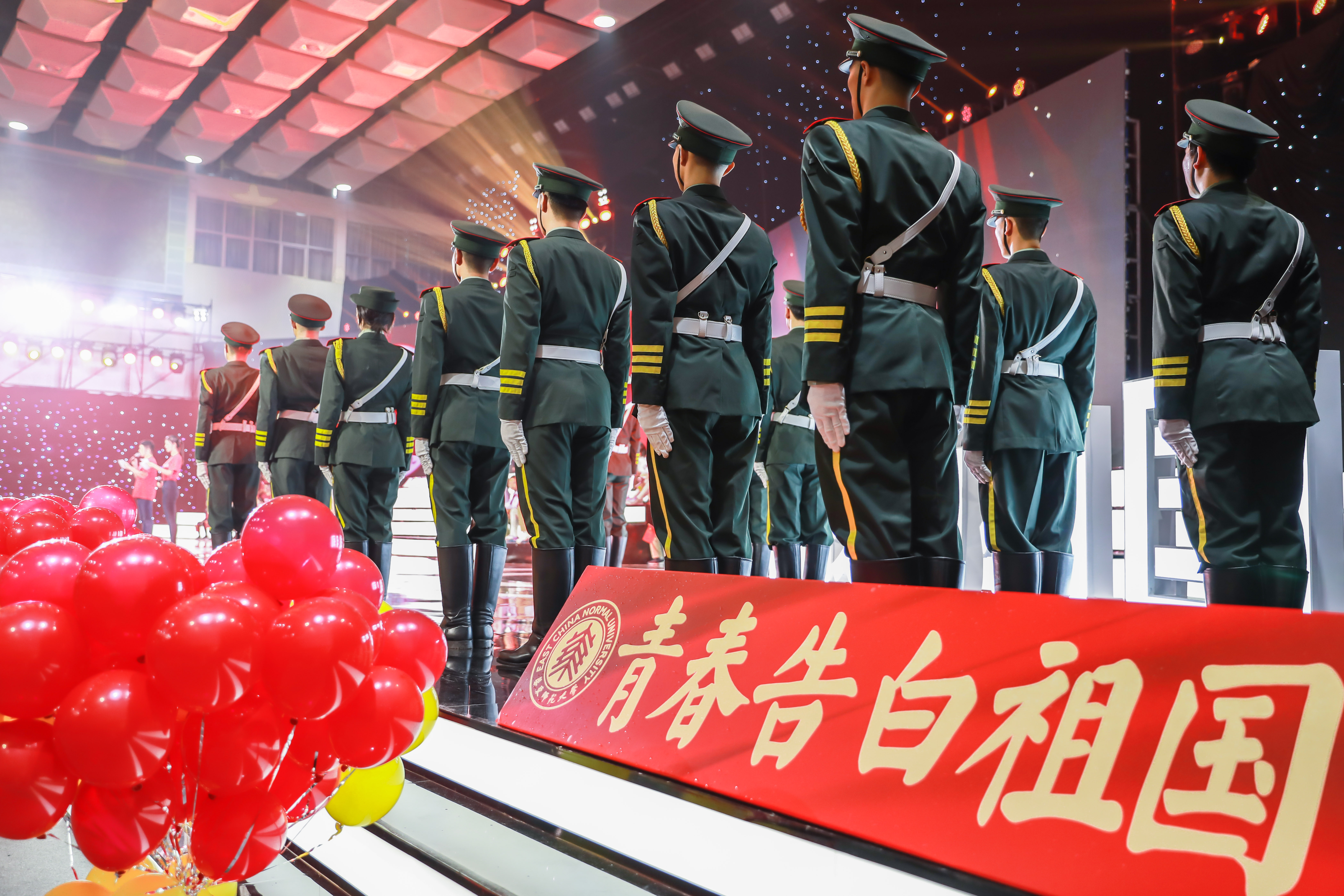 承担本次升旗任务的是华东师大国旗护卫队的同学们。国旗护卫队是依托华东师大退伍大学生建立的一支担任国旗升降任务的队伍。今天,他们身着军装、英姿挺拔,以饱满的精神、昂扬的斗志,完成了这最动人的一次升旗仪式,展现出华东师大学子忠贞赤诚的爱国情怀。
