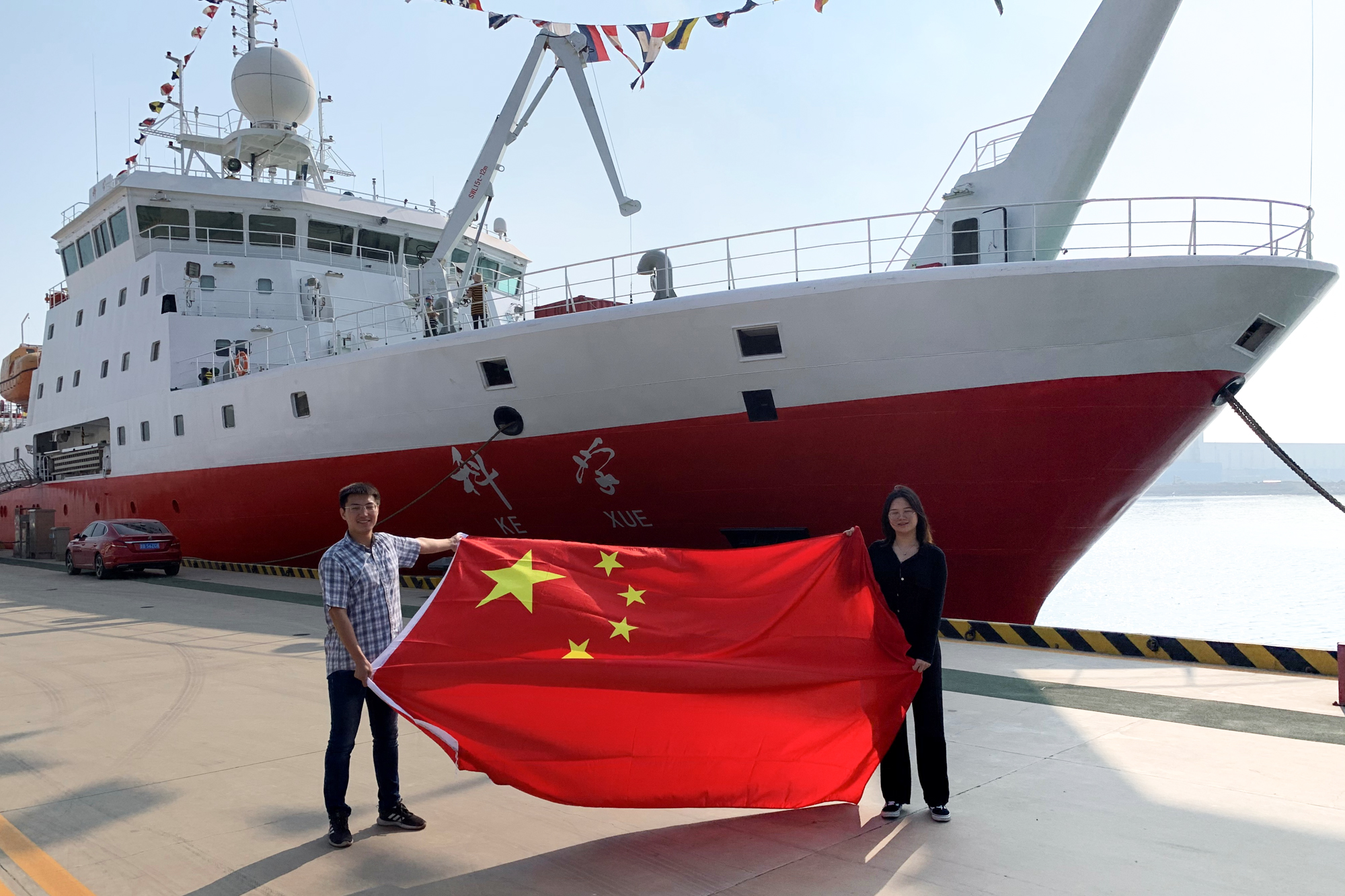 河口海科学研究院海洋生物学2018级硕士研究生宗常兴、卫念从“科学号”考察船前发来的祝福