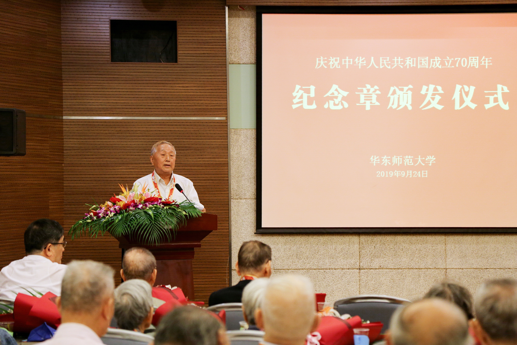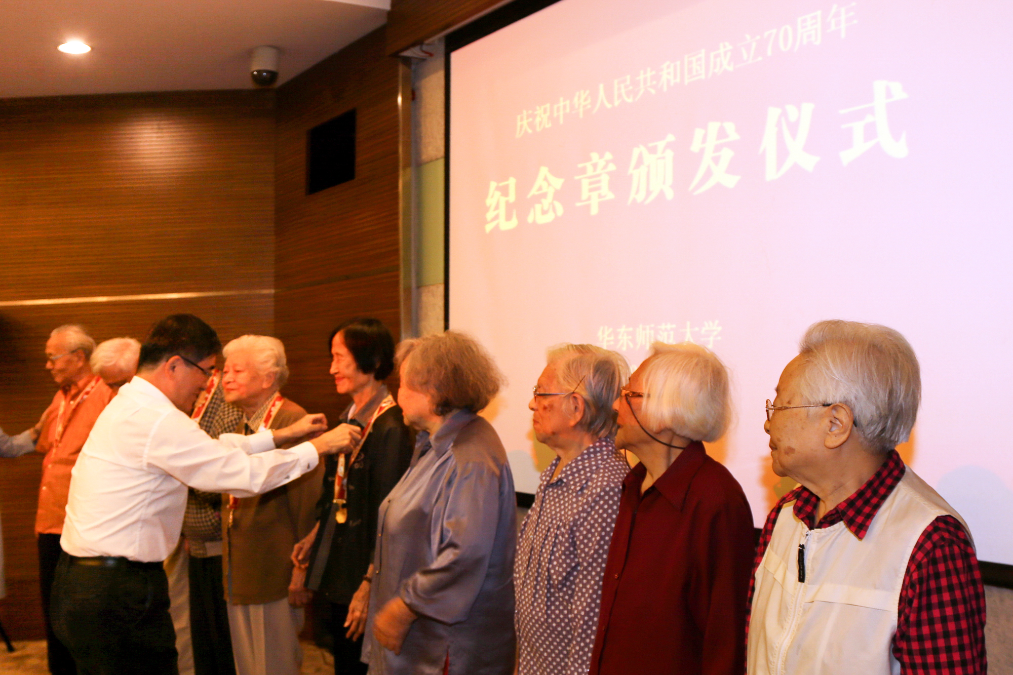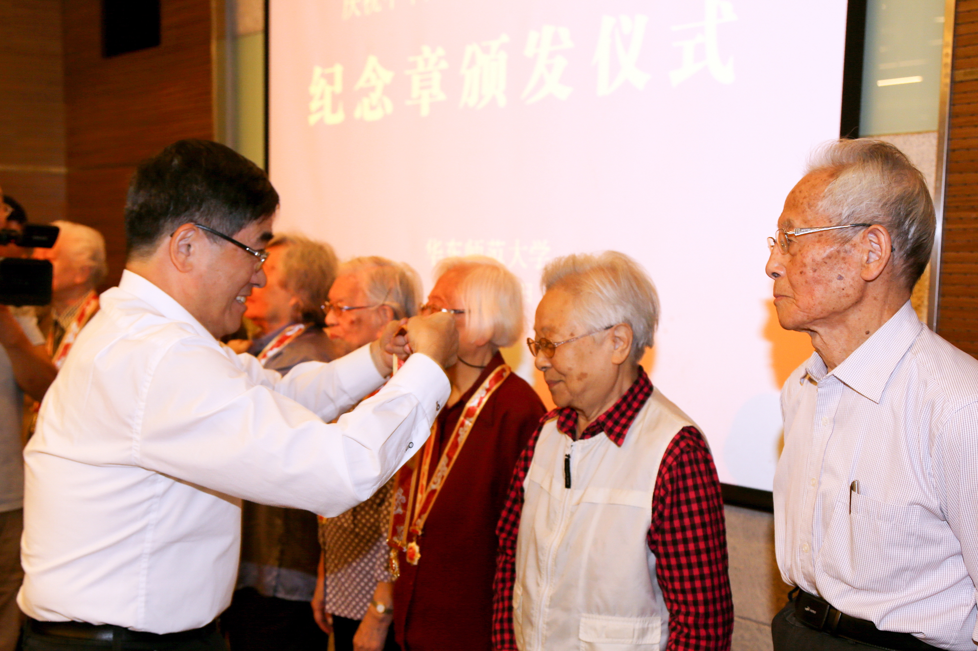 颁章仪式在全场庄重奏唱国歌声中开始,梅兵宣读了与会获颁纪念章人员名单,童世骏一一为老同志佩挂纪念章,向他们表示祝贺和感谢,学生代表向老同志献花致敬。
