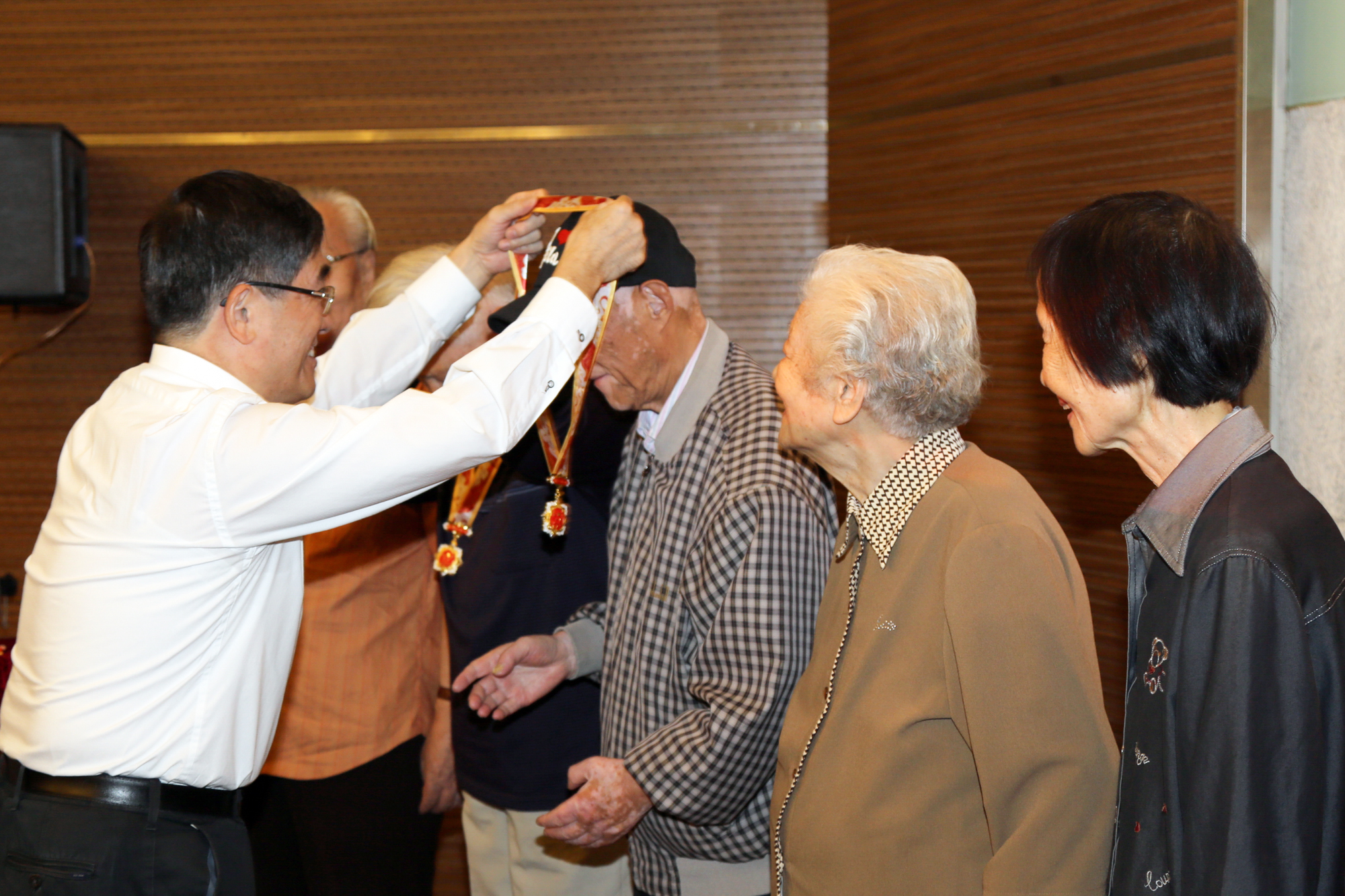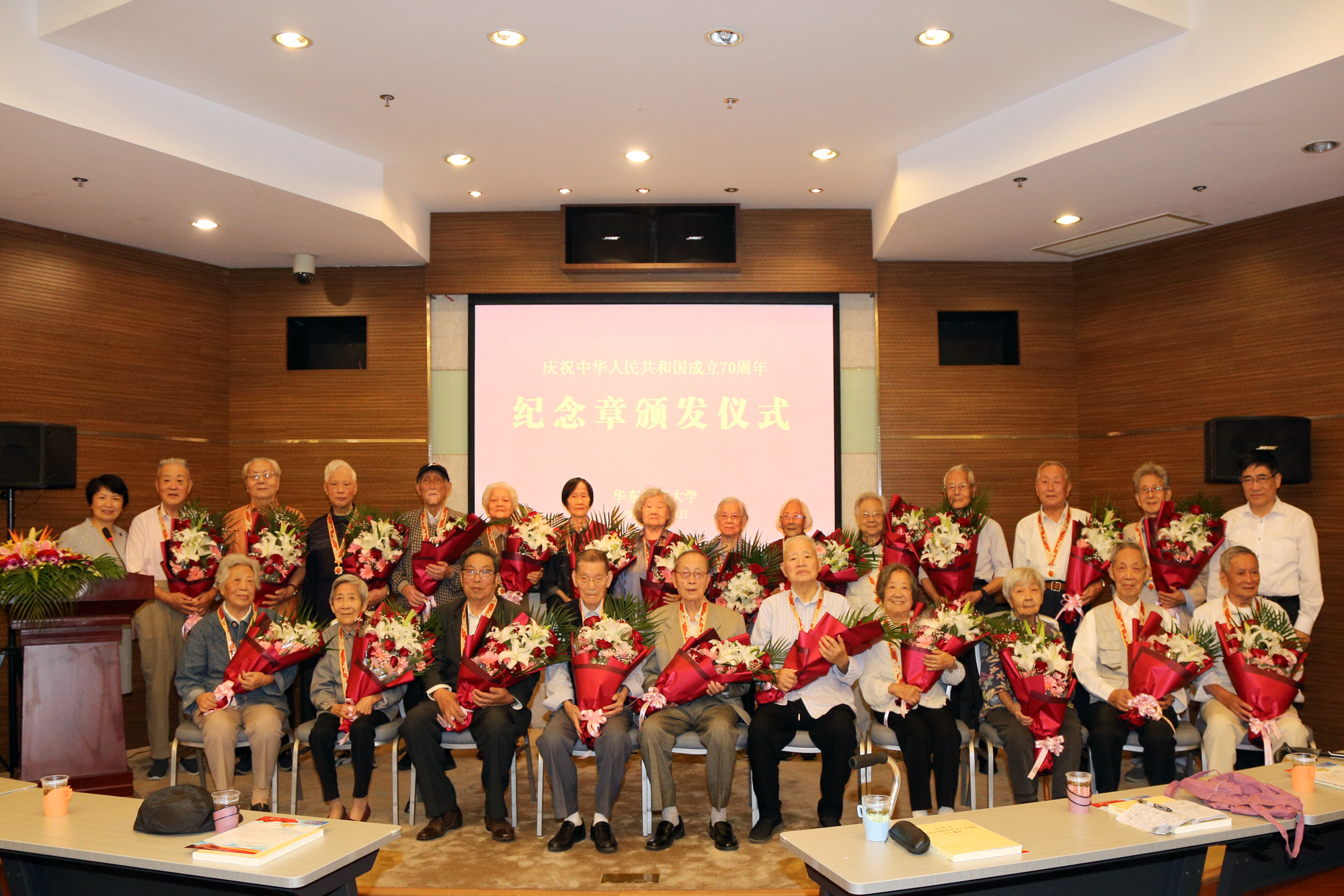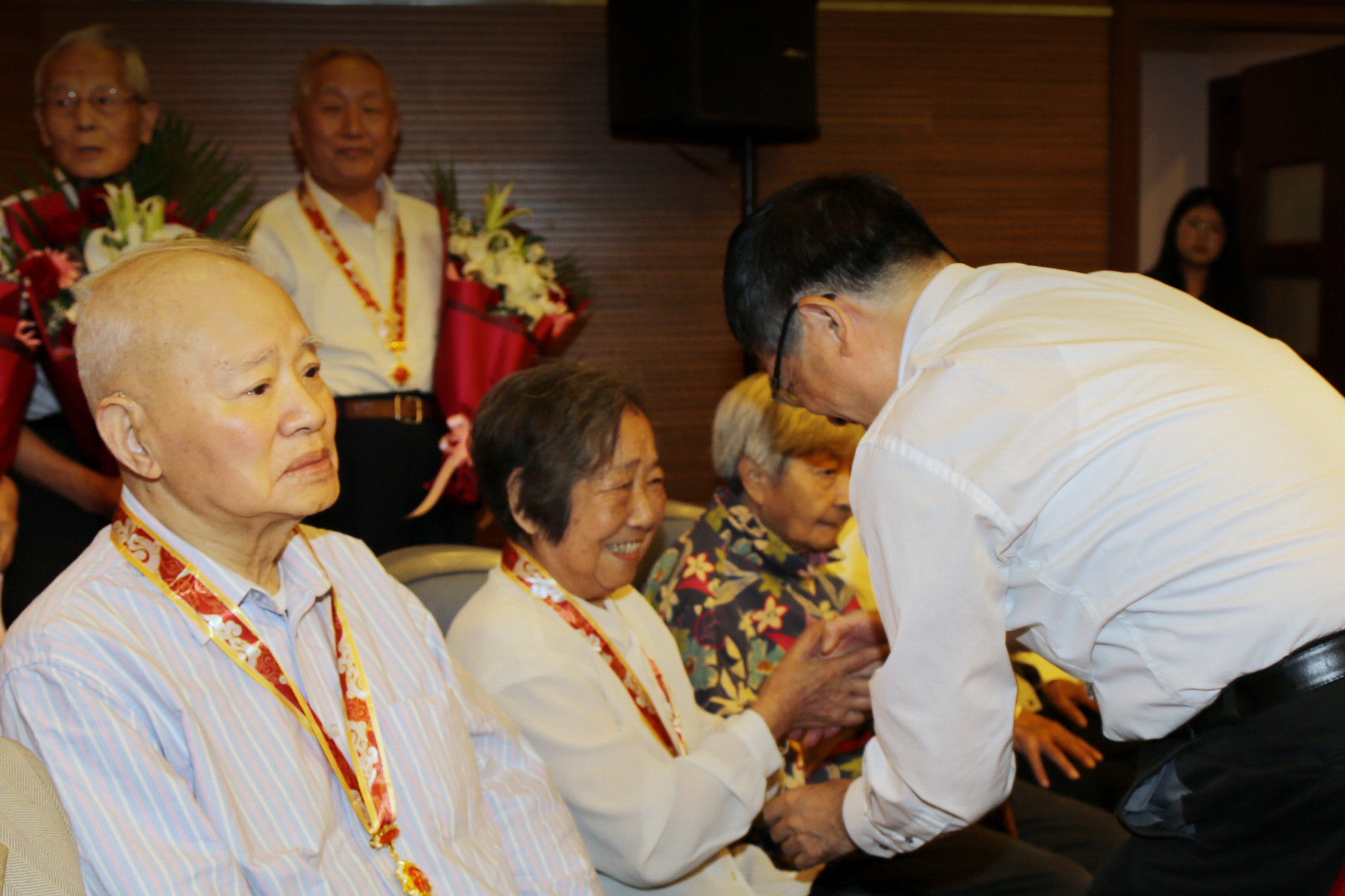 颁章仪式在全场庄重奏唱国歌声中开始,梅兵宣读了与会获颁纪念章人员名单,童世骏一一为老同志佩挂纪念章,向他们表示祝贺和感谢,学生代表向老同志献花致敬。