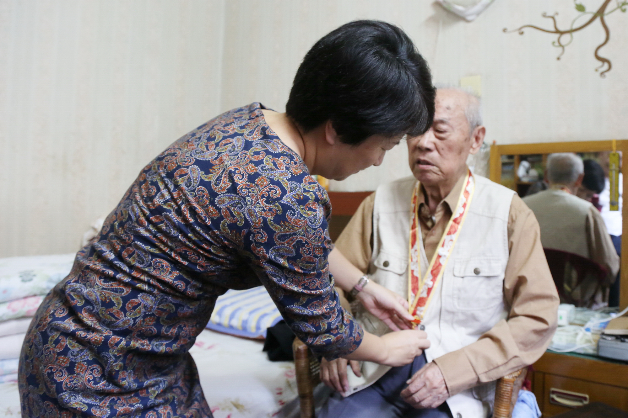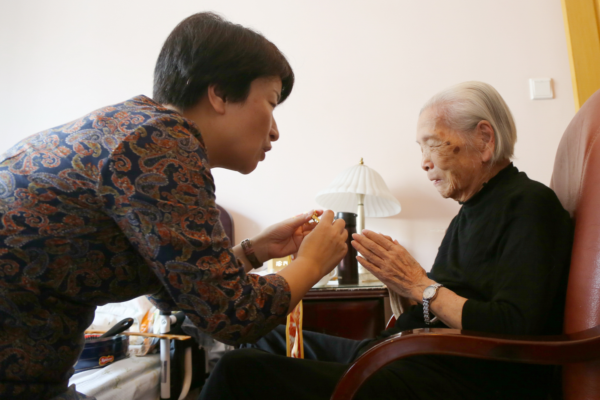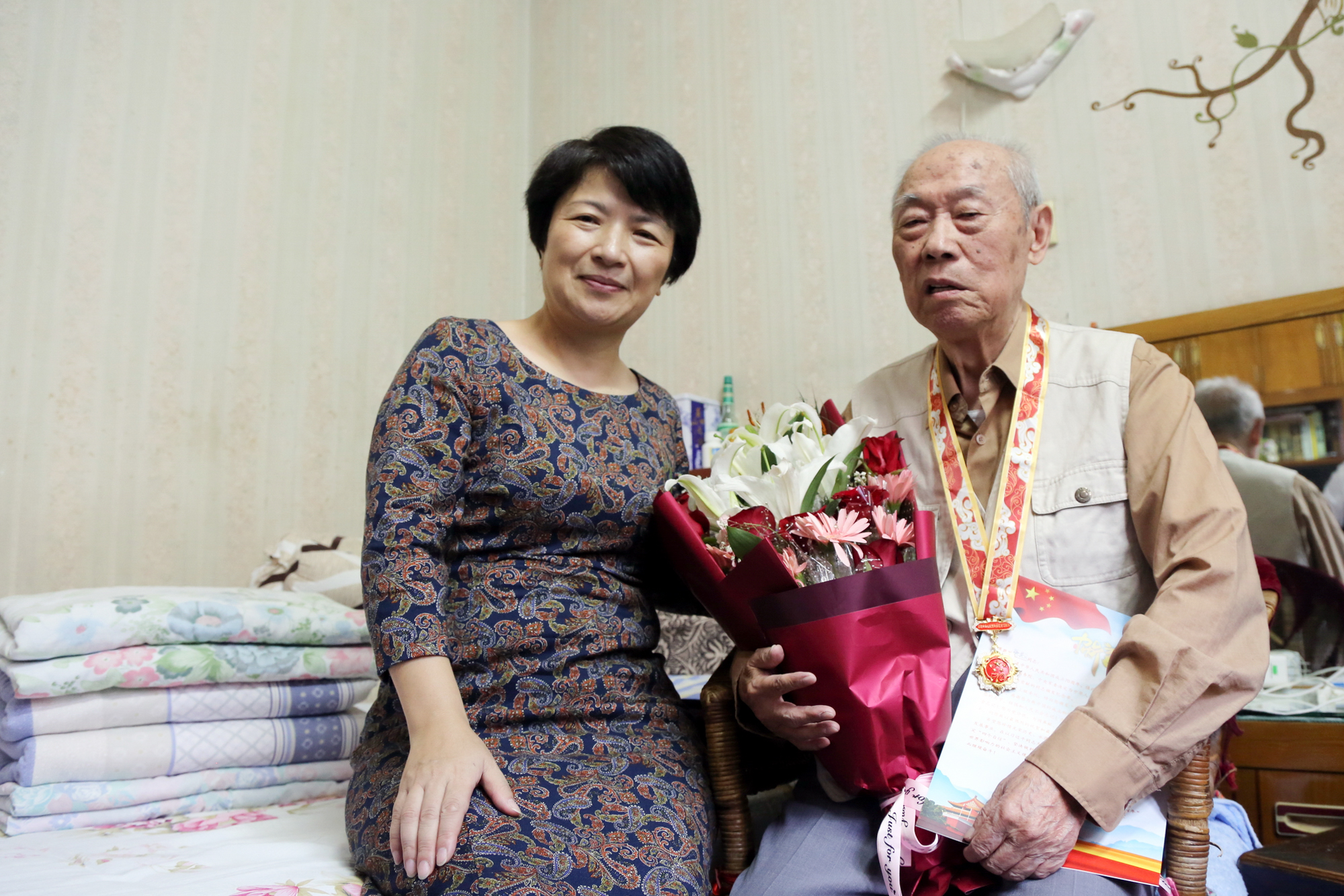 副校长梅兵上门慰问,为96岁老同志顾雅珍和抗战老同志蒋其义颁章
